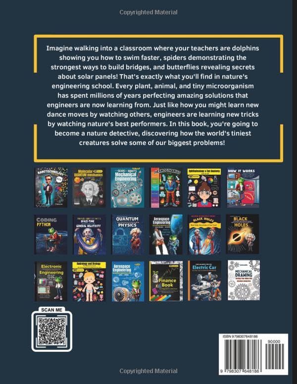 Unlock the extraordinary world of nature’s greatest inventions with your child! “Nature’s Amazing Inventions” bridges the fascinating connection between the animal kingdom and modern technology, showing young minds how engineers and scientists find inspiration in the most unexpected places. Did you know that the sleek Japanese bullet train was designed by studying kingfisher birds? Or that robot designers learned to create better gripping mechanisms by observing gecko feet? This beautifully illustrated book takes children on an incredible journey, revealing how nature’s solutions have revolutionized human technology. Perfect for curious minds aged 8-12, this book transforms complex engineering concepts into engaging, easy-to-understand explination. Each chapter pairs a fascinating creature with the groundbreaking technology it inspired, accompanied by stunning illustrations that bring these connections to life. From penguins swimming underwater to termites building temperature-controlled homes, your child will discover how nature’s wisdom shapes our world. More than just a science book, “Nature’s Amazing Inventions” sparks imagination and encourages children to see the world differently. It shows them how engineers and scientists observe nature to solve human challenges, inspiring the next generation of innovative thinkers and problem-solvers. Give your child the gift of discovery and watch their curiosity bloom as they explore the incredible ways nature and technology work together! “Biomimicry: Nature’s Engineering for Kids” Explore Inventions, Projects, and Problem-Solving Inspired by Nature’s Creatures, Plants, and Animals–Discover the Secrets of Technology and Design, from Cooling Systems and Screens to Robotics!”