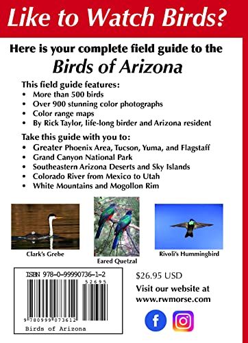 A comprehensive bird field guide for the State of Arizona with over 900 photographs. Small enough to fit in cargo pant pockets. More than 500 species of birds are described including alternate plumages, voice, habitat, elevation ranges, behavior and noteworthy comments. Color coded range maps for all major species illustrate seasonal occurrences. Nationally, Arizona has the most number of hummingbirds and a specific chart shows their elevations.