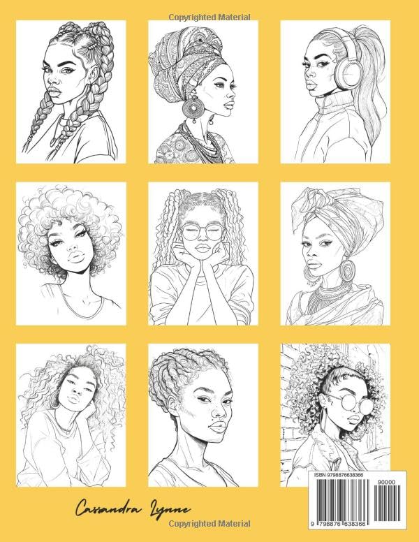 Bring these extraordinary portraits of black beauties to life. 34 Beautiful Coloring Pages One Sided Pages for No Bleedthrough 8.5 x 11 Inches Pages Each page is a canvas for your colorful creativity, bringing to life the diversity and proudly showcasing the uniqueness of each woman. Immerse yourself in the therapeutic art of coloring while celebrating the strength, elegance, and diversity of this beautiful community.