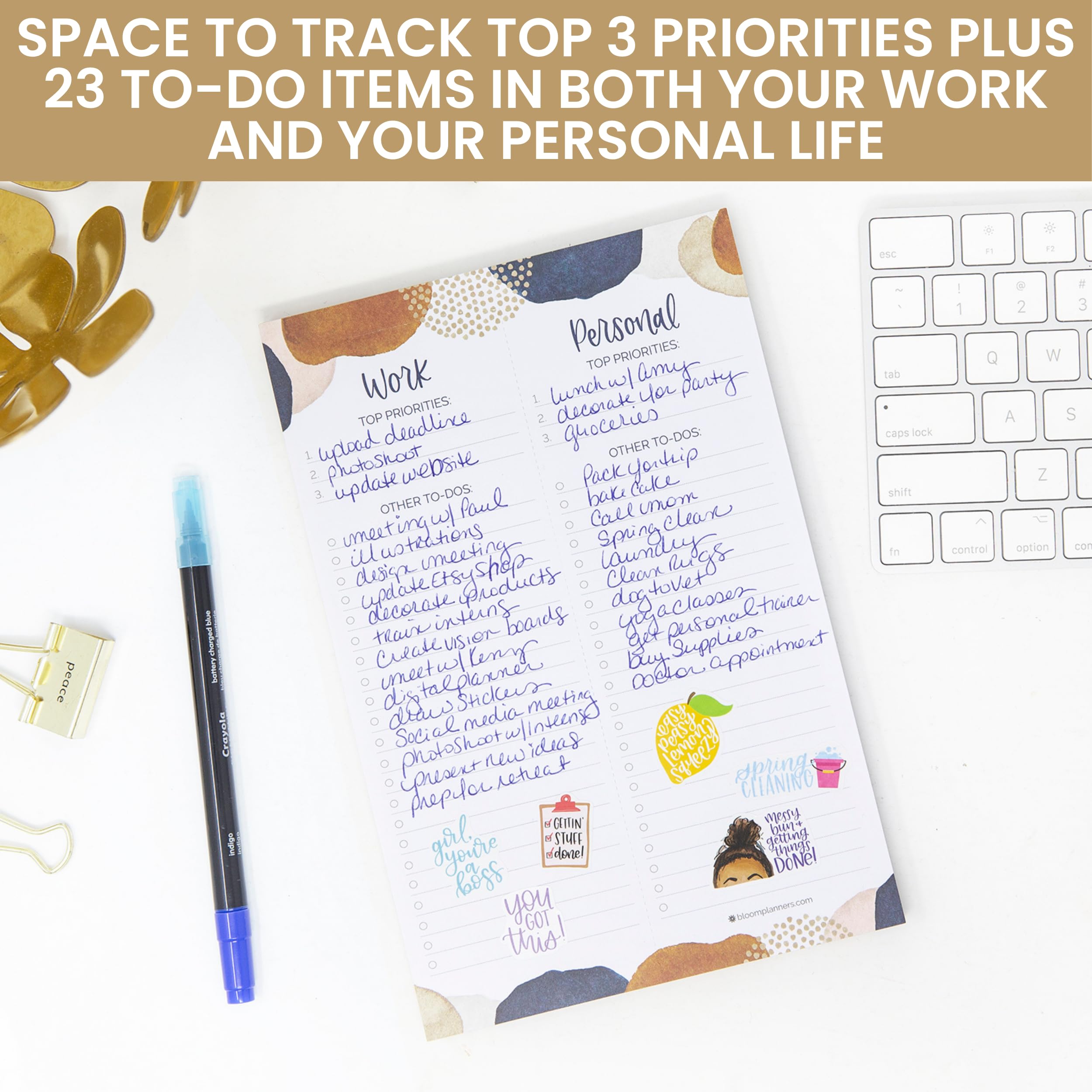 Space to track top 3 priorities plus 23 to-do items in both your work and your personal life
