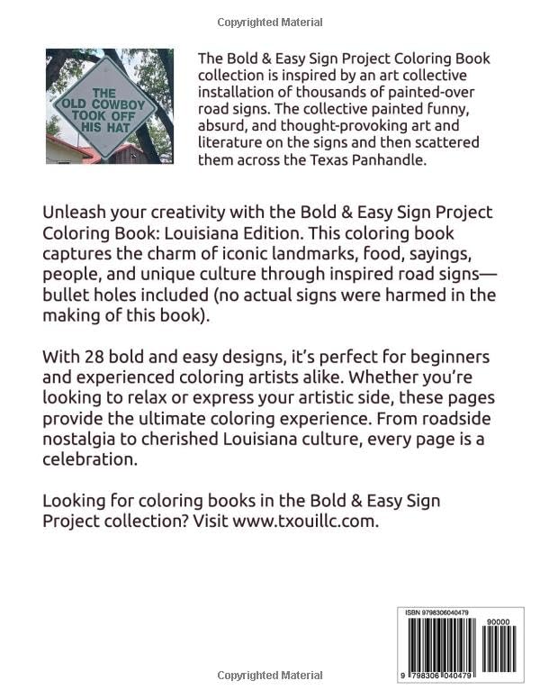 Bold & Easy meets the Dynamite Museum Sign Project in Louisiana! Get ready to unleash your inner artist where coloring outside the lines isn’t just encouraged, it’s mandatory! This is not your grandma’s coloring book (unless your grandma is super cool and into quirky roadside art). Packed with eccentric designs inspired by the wild and wacky installations of the Dynamite Museum art collective Sign Project in the Texas Panhandle, this book is guaranteed to blow up your creativity. Perfect for when you need a break from adulting, or when your coffee table needs a serious upgrade from boring to bombastic. Grab your crayons, markers, or whatever makes you feel like a kid again, and prepare for a coloring experience that’s as explosive as your imagination! Keep scrolling for a look inside the book. The Bold & Easy Sign Project Coloring Book collection is perfect for: Comedy fans: Who doesn’t like to laugh? Plan a shared activity that sparks creativity and laughter. Stress relief: Escape the daily grind and relax with the meditative joy of coloring. Art enthusiasts: Unleash your inner artist with bold and easy designs. History buffs: Own a piece of the fascinating story that is the Dynamite Museum Sign Project blended with Louisiana culture. Keep scrolling for a look inside the book. This book contains the following signs: CRAB BOIL DAT’S HOW WE DO IT POVERTY POINT FIRST ARTIFICIAL HEART CAJUN AT HEART ETOUFFEE CADDO LAKE THE LAFAYETTE UFO SWAMP POP THE BYRD GANG ZYDECO BATON ROUGE FATS DOMINO MIGHTY MISSISSIPPI DELTA VIVE LA LOUISIANE LET THE GOOD TIMES ROLL BLACK GOLD CARNIVAL KREWES PRALINE PIE THE JOINT BBQ RIVER WALK THE BLUES HIGHWAY RED RIVER VALLEY TENNESSEE WILLIAMS FESTIVAL TAKE A DIP IN THE CAJUN LAGOON MARY PICKFORD/SILENT FILM STAR I LOVE YOU MORE THAN LA NEW ORLEANS LA Keep scrolling for a look inside the book.