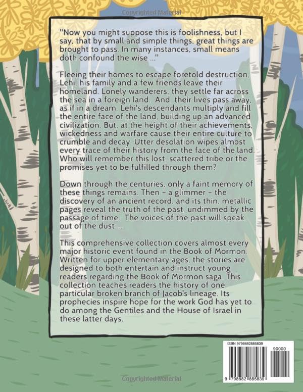 Now you might suppose this is foolishness, but I say, that by small and simple things, great things are brought to pass. In many instances, small means doth confound the wise … Fleeing their homes to escape foretold destruction, Lehi, his family and a few friends leave their homeland. Lonely wanderers, they settle far across the sea in a wilderness paradise. And, their lives pass away, as if in a dream. Lehi’s descendants multiply and fill the entire face of the land, building up an advanced civilization. But, at the height of their achievements, wickedness and warfare cause their entire culture to crumble and decay. Utter desolation wipes almost every trace of their history from the face of the land. Who will remember this lost, scattered tribe or the promises yet to be fulfilled through them? Down through the centuries, only a faint memory of these things remains. Then – a glimmer – the discovery of an ancient record, and its thin, metallic pages reveal the truth of the past, undimmed by the passage of time. The voices of the past will speak out of the dust … This comprehensive collection covers almost every major historic event found in the Book of Mormon. Written for upper elementary ages, the stories are designed to both entertain and instruct young readers regarding the Book of Mormon saga. This collection teaches readers the history of one particular broken branch of Jacob’s lineage. Its prophecies inspire hope for the work God has yet to do among the Gentiles and the House of Israel in these latter days. NOTE: Scripture references are based on the RLDS 1908 publication of the Book of Mormon.