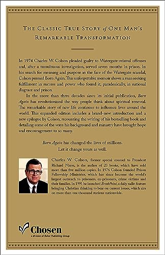 In 1974 Charles W. Colson pleaded guilty to Watergate-related offenses and, after a tumultuous investigation, served seven months in prison. In his search for meaning and purpose in the face of the Watergate scandal, Colson penned Born Again. This unforgettable memoir shows a man who, seeking fulfillment in success and power, found it, paradoxically, in national disgrace and prison. In more than three decades since its initial publication, Born Again has brought hope and encouragement to millions. This remarkable story of new life continues to influence lives around the world. This expanded edition includes a brand-new introduction and a new epilogue by Colson, recounting the writing of his bestselling book and detailing some of the ways his background and ministry have brought hope and encouragement to so many.