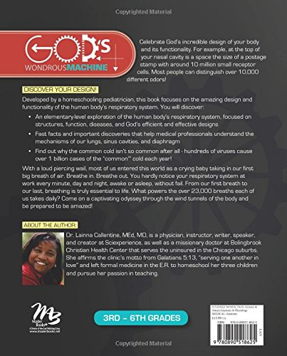 Celebrate God’s incredible design of your body and its functionality. For example, at the top of your nasal cavity is a space the size of a postage stamp with around 10 million small receptor cells, Most people can distinguish over 10,000 different odors! DISCOVER YOUR DESIGN! Developed by a homeschooling pediatrician, this book focuses on the amazing design and functionality of the human body’s respiratory system. You will discover: An elementary-level exploration of the human body’s respiratory system, focused on structures, function, diseases, and God’s efficient and effective designs Fast facts and important discoveries that help medical professionals understand the mechanisms of our lungs, sinus cavities, and diaphragm Find out why the common cold isn’t so common after all – hundreds of viruses cause over 1 billion cases of the “common” cold each year! With a loud piercing wail, most of us entered this world as a crying baby taking in our first big breath of air. Breathe in. Breathe out. You hardly notice your respiratory system at work every minute, day and night, awake or asleep, without fail. From our first breath to our last, breathing is truly essential to life. What powers the over 23,000 breaths each of us takes daily? Come on a captivating odyssey through the wind tunnels of the body and be prepared to be amazed!