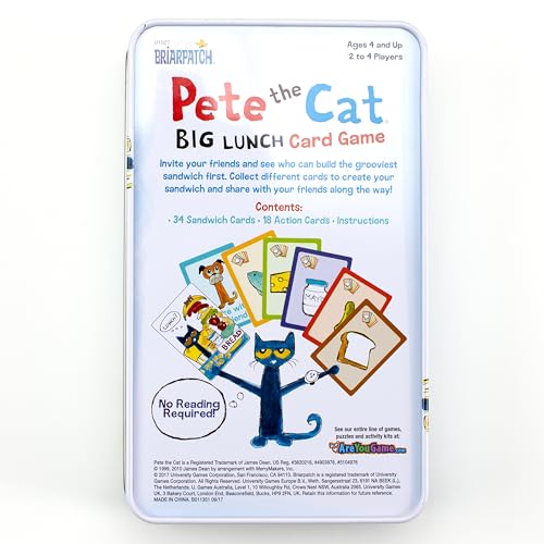 Kids love Pete the Cat, the coolest cat around. In this ingredient stacking game, kids can collect different food cards to help Pete create a groovy sandwich. The game reinforces color recognition and collaborative play. Be the first player to create a proper sandwich using six different colored food cards to win. Contains 34 food cards, 18 action cards, and instructions, in a travel-friendly tin. University Games’ Briarpatch division is America’s leading preschool game and puzzle line, with 20 years of innovative and exceptional learning games.