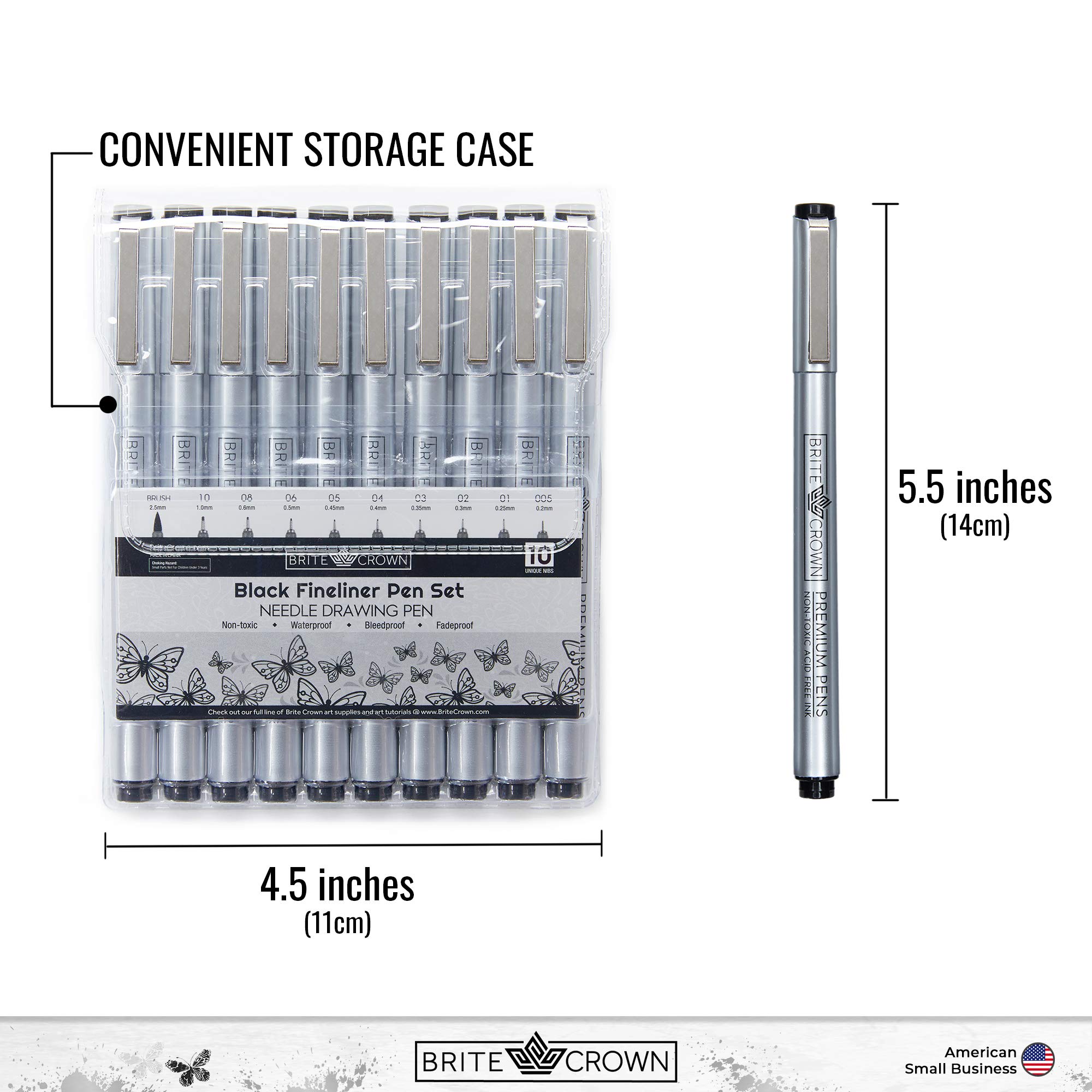 Brite Crown Drawing And Sketching Pens Set – 10 Black Fineliner Pens 0.2mm To 1.0mm Width Tips & 2.5mm Micro Calligraphy Brush-tip Pen, Ideal Gift Idea For Artists And Beginners