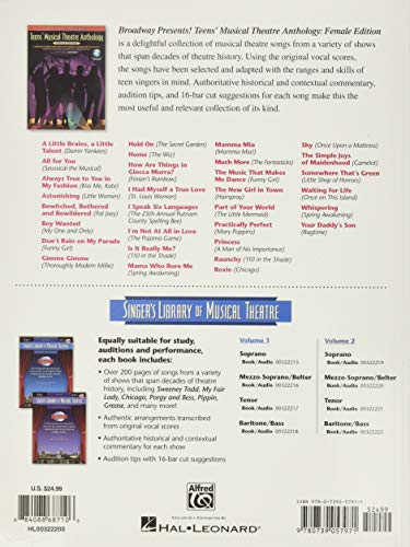 (Vocal Collection). Broadway Presents! Teens’ Musical Theatre Anthology: Female Edition is a delightful collection of musical theatre songs from a variety of shows that span decades of theatre history. Using the original vocal scores, the songs have been selected and adapted with the ranges and skills of teen singers in mind. Authoritative historical and contextual commentary, audition tips, and 16-bar cut suggestions for each song make this the most useful and relevant collection of its kind. The audio includes piano accompaniment tracks. Songs include: A Little Brains, a Little Talent (from Damn Yankees ) * All for You ( Seussical the Musical ) * Always True to You in My Fashion * ( Kiss Me Kate ) * Astonishing ( Little Women ) * Bewitched, Bothered and Bewildered * ( Pal Joey ) * Boy Wanted ( My One and Only * Don’t Rain on My Parade ( Funny Girl ) * Gimme Gimme ( Thoroughly Modern Millie ) * Hold On ( The Secret Garden ) * Home ( The Wiz ) * How Are Things in Glocca Morra? ( Finian’s Rainbow ) * I Had Myself a True Love ( St. Louis Woman ) * I Speak Six Languages ( The 25th Annual Putnam County Spelling Bee ) * I’m Not At All in Love ( The Pajama Game ) * Is It Really Me? * ( 110 in the Shade ) * Mama Who Bore Me ( Spring Awakening ) * Mamma Mia ( Mamma Mia ) * Much More ( The Fantasticks ) * The Music That Makes Me Dance ( Funny Girl ) * The New Girl in Town ( Hairspray ) * Part of Your World ( The Little Mermaid ) * Practically Perfect ( Mary Poppins ) * Princess ( A Man of No Importance ) * Raunchy ( 110 in the Shade ) * Roxie ( Chicago ) * Show Me ( My Fair Lady ) * Shy ( Once Upon a Mattress ) * The Simple Joys of Maidenhood ( Camelot ) * Somewhere That’s Green ( Little Shop of Horrors ) * Waiting for Life ( Once on This Island ) * Whispering ( Spring Awakening ) * Your Daddy’s Son (Ragtime). Audio is accessed online using the unique code inside the book and can be streamed or downloaded. The audio files include PLAYBACK+, a multi-functional audio player that allows you to slow down audio without changing pitch, set loop points, change keys, and pan left or right.