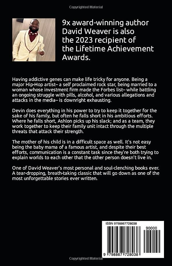 Having addictive genes can make life tricky for anyone. Being a major Hip-Hop artist- a self proclaimed rock star, being married to a woman whose investment firm made the Forbes list- while battling an ongoing struggle with pills, alcohol, and various allegations and attacks in the media- is downright exhausting. Devin does everything in his power to try to keep it together for the sake of his family, but often he falls short in his ambitious efforts. Where he falls short, Ashlon picks up his slack; and as a team, they work together to keep their family unit intact through the multiple threats that attack their strength. The mother of his child is in a difficult space as well. It’s not easy being the baby mama of a famous artist, and despite their best efforts, communication is a constant task since they’re both trying to explain worlds to each other that the other person doesn’t live in. One of David Weaver’s most personal and soul-clenching books ever. A tear-dropping, breath-taking classic that will go down as one of the most unforgettable stories ever written.