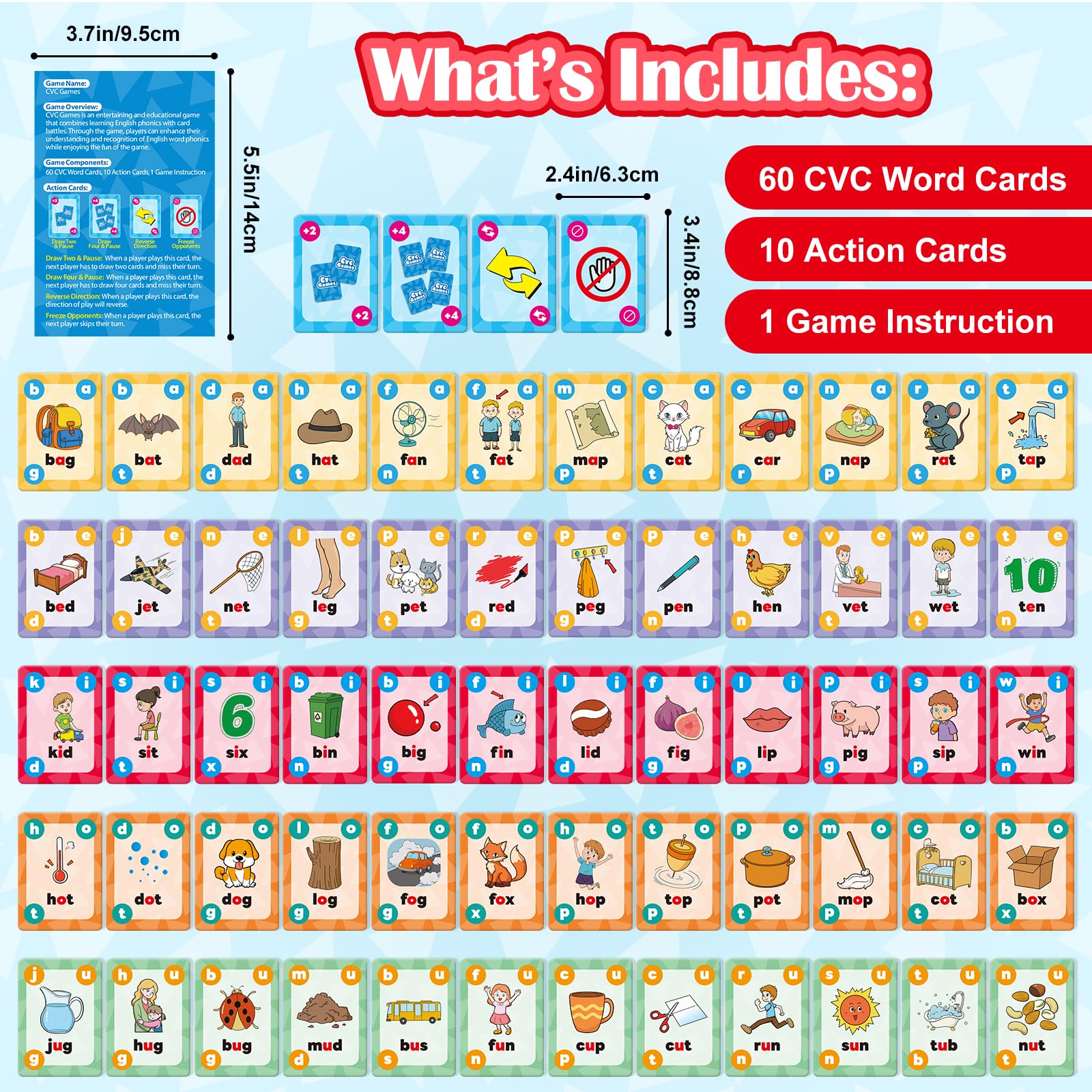 - Complete Learning Set: This educational set comes with 60 CVC word cards, 10 action cards, and a comprehensive instruction manual. The diverse range of cards allows children to learn and recognize 60 different CVC (consonant-vowel-consonant) words. This extensive selection helps significantly boost their phonemic awareness and enhances their reading fluency, providing a well-rounded foundation for early literacy development.