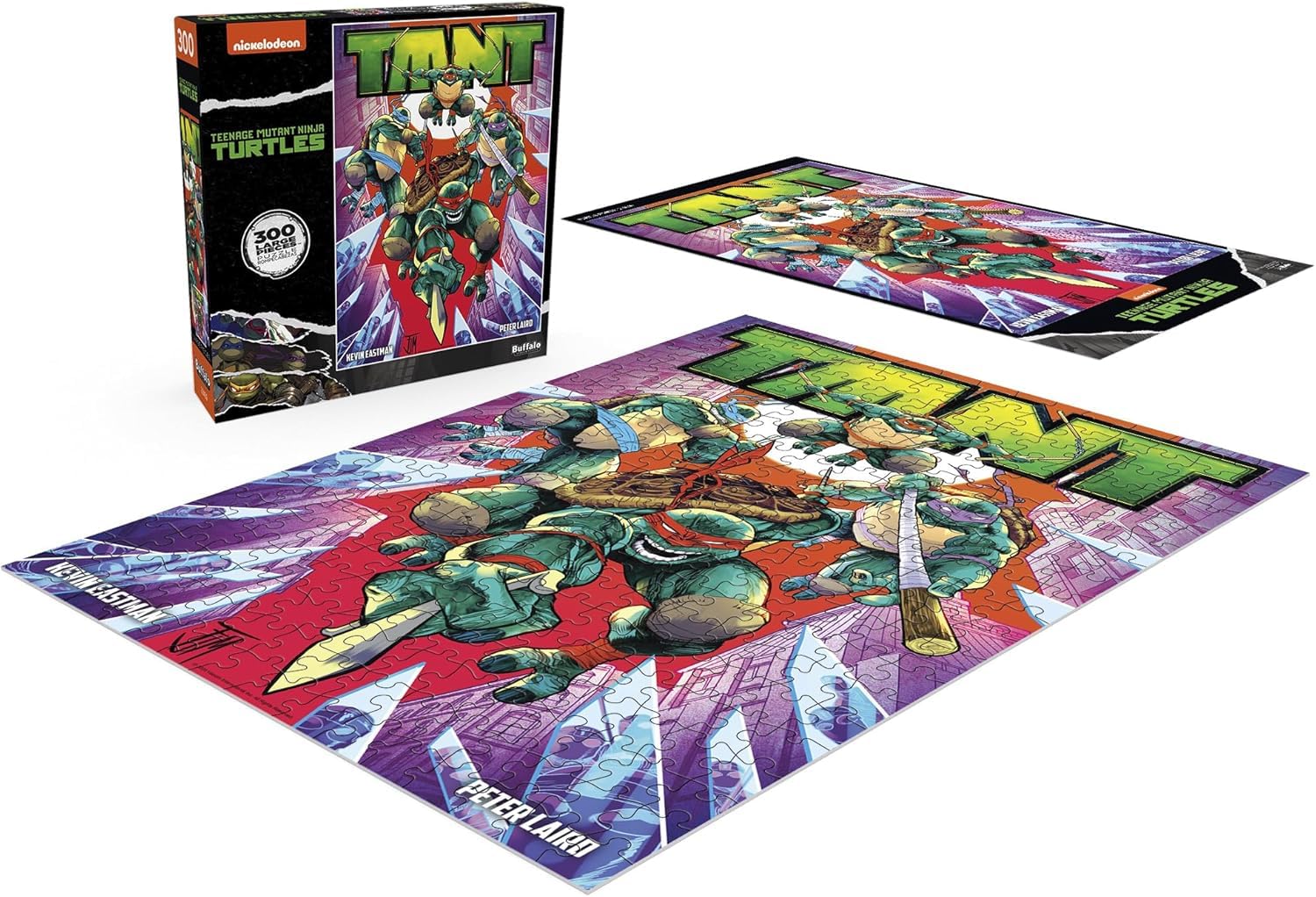This Buffalo Games 300-piece Teenage Mutant Ninja Turtles jigsaw puzzle features Leonardo, Michelangelo, Donatello, and Raphael as they leap into action to defend their home from villains and save the day. Enter the sewers of New York City and join the Teenage Mutant Ninja Turtles on their thrilling adventures as you piece together this action-packed puzzle! The pieces of this puzzle are larger than traditional puzzle pieces, which makes them easier to see and hold for a pleasant puzzle experience. Every Buffalo Games jigsaw puzzle is manufactured from recycled puzzle board. A precision cutting technique guarantees that every piece will fit soundly with the company’s signature Perfect Snap(tm). A bonus puzzle poster is also included so that you have a handy reference of what the completed puzzle should look like while you put yours together. (c)2024 Viacom International Inc.