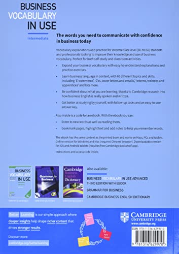 The words you need to communicate with confidence in business today. Vocabulary explanations and practice for intermediate (B1 to B2) students and professionals looking to improve their knowledge and use of business English. This book is perfect for both self-study and classroom activities. Inside the book is a code for an ebook that can be used online with Macs, PCs and tablets. It can also be downloaded to iOS and Android tablets using the free Cambridge Bookshelf app. The ebook has the same content as the printed book, plus features such as audio so that you can listen to the words as well as reading them.