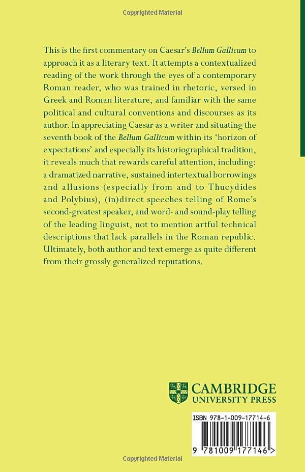 This is the first commentary on Caesar’s Bellum Gallicum to approach it as a literary text. It attempts a contextualized reading of the work through the eyes of a contemporary Roman reader, who was trained in rhetoric, versed in Greek and Roman literature, and familiar with the same political and cultural conventions and discourses as its author. In appreciating Caesar as a writer and situating the seventh book of the Bellum Gallicum within its ‘horizon of expectations’ and especially its historiographical tradition, it reveals much that rewards careful attention, including: a dramatized narrative, sustained intertextual borrowings and allusions (especially from and to Thucydides and Polybius), (in)direct speeches telling of Rome’s second-greatest speaker, and word- and sound-play telling of the leading linguist, not to mention artful technical descriptions that lack parallels in the Roman republic. Ultimately, both author and text emerge as quite different from their grossly generalized reputations.