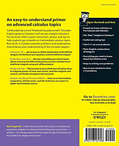 An easy-to-understand primer on advanced calculus topics Calculus II is a prerequisite for many popular college majors, including pre-med, engineering, and physics. Calculus II For Dummies offers expert instruction, advice, and tips to help second semester calculus students get a handle on the subject and ace their exams. It covers intermediate calculus topics in plain English, featuring in-depth coverage of integration, including substitution, integration techniques and when to use them, approximate integration, and improper integrals. This hands-on guide also covers sequences and series, with introductions to multivariable calculus, differential equations, and numerical analysis. Best of all, it includes practical exercises designed to simplify and enhance understanding of this complex subject. Introduction to integration Indefinite integrals Intermediate Integration topics Infinite series Advanced topics Practice exercises Confounded by curves? Perplexed by polynomials? This plain-English guide to Calculus II will set you straight!