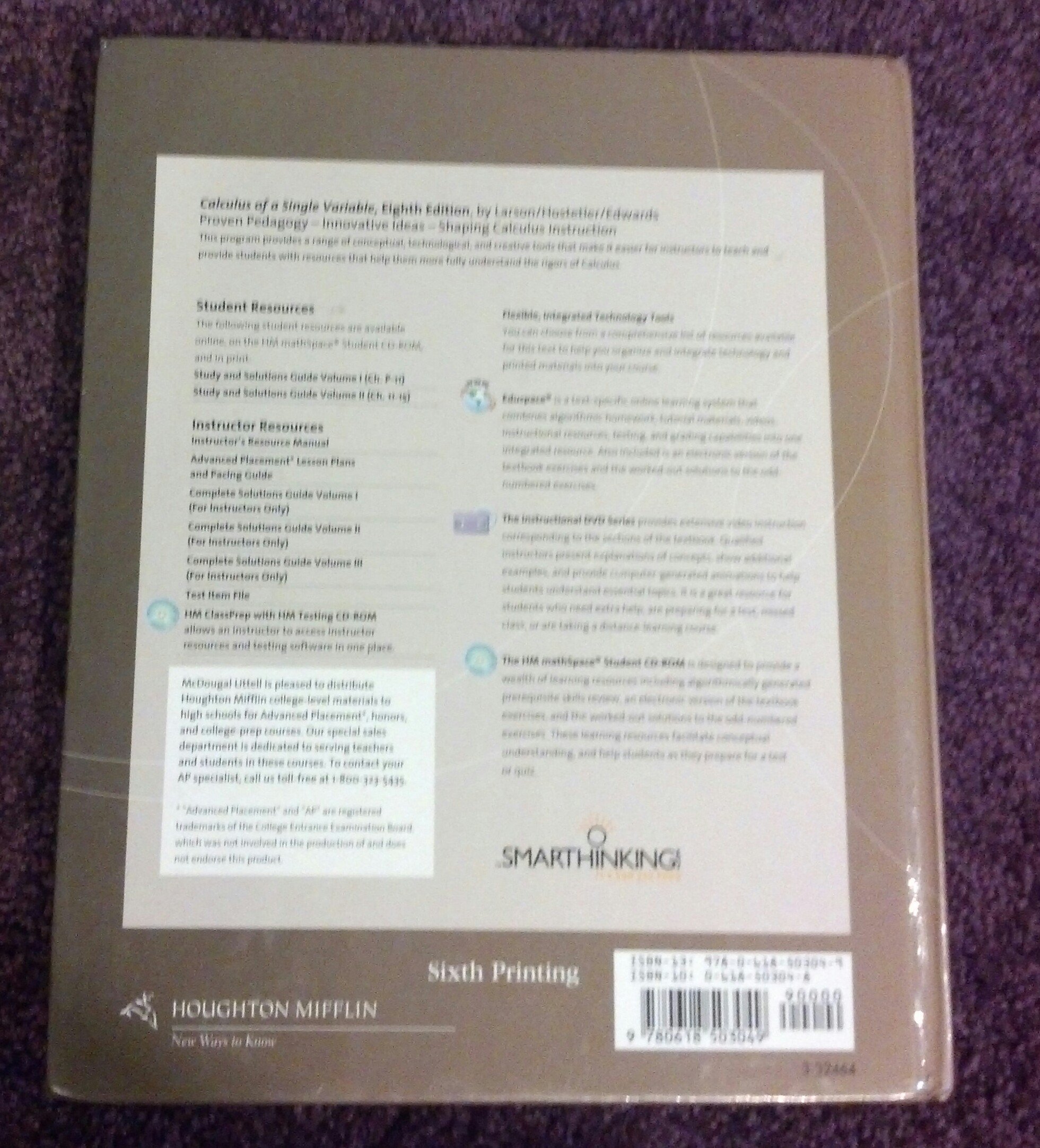 Ideal for the single-variable, one-, or two-semester calculus course, Calculus of a Single Variable, 8/e, contains the first 9 chapters of Calculus, 8/e. The text continues to offer instructors and students new and innovative teaching and learning resources. The Calculus series was the first to use computer-generated graphics, to include exercises involving the use of computers and graphing calculators, to be available in an interactive CD-ROM format, to be offered as a complete, online calculus course, and to offer a two-semester Calculus I with Precalculus text. Every edition of the series has made the mastery of traditional calculus skills a priority, while embracing the best features of new technology and, when appropriate, calculus reform ideas. Now, the Eighth Edition is the first calculus program to offer algorithmic homework and testing created in Maple so that answers can be evaluated with complete mathematical accuracy. Two primary objectives guided the authors in writing this book: to develop precise, readable materials for students that clearly define and demonstrate concepts and rules of calculus and to design comprehensive teaching resources for instructors that employ proven pedagogical techniques and saves the instructor time. The Eighth Edition continues to provide an evolving range of conceptual, technological, and creative tools that enable instructors to teach the way they want to teach and students to learn they way they learn best.