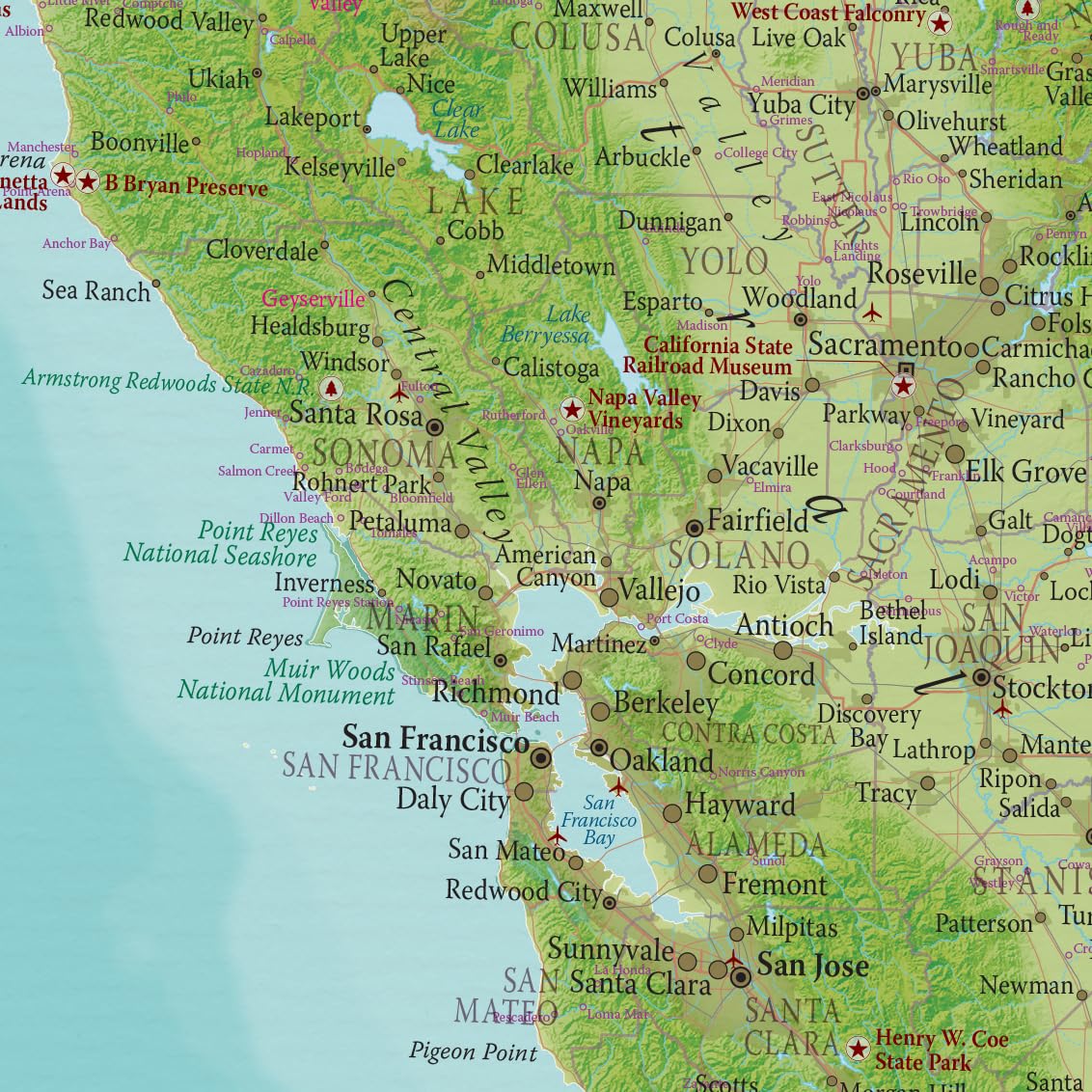 - Map of California – topographic terrain detail showcasing the landform tints and natural features of California.