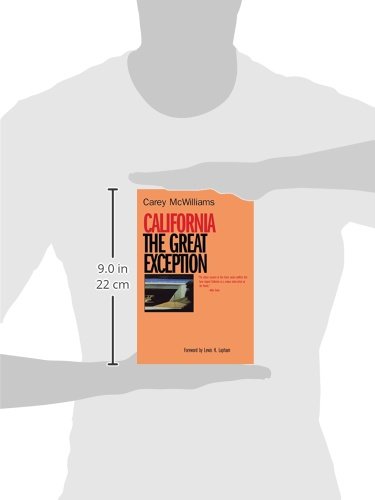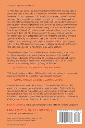 In 1949, lawyer, historian, and journalist Carey McWilliams stepped back to assess the state of California at the end of its first one hundred years–its history, population, politics, agriculture, and social concerns. As he examined the reasons for the prodigious growth and productivity that have characterized California since the Gold Rush, he praised the vitality of the new citizens who had come from all over the world to populate the state in a very short time. But he also made clear how brutally the new Californians dealt with “the Indian problem,” the water problem, and the need for migrant labor to facilitate California’s massive and highly profitable agricultural industry. As we look back now on 150 years of statehood, it is particularly useful to place the events of the past fifty years in the context of McWilliams’s assessment in California: The Great Exception. Lewis Lapham has written a new foreword for this edition.