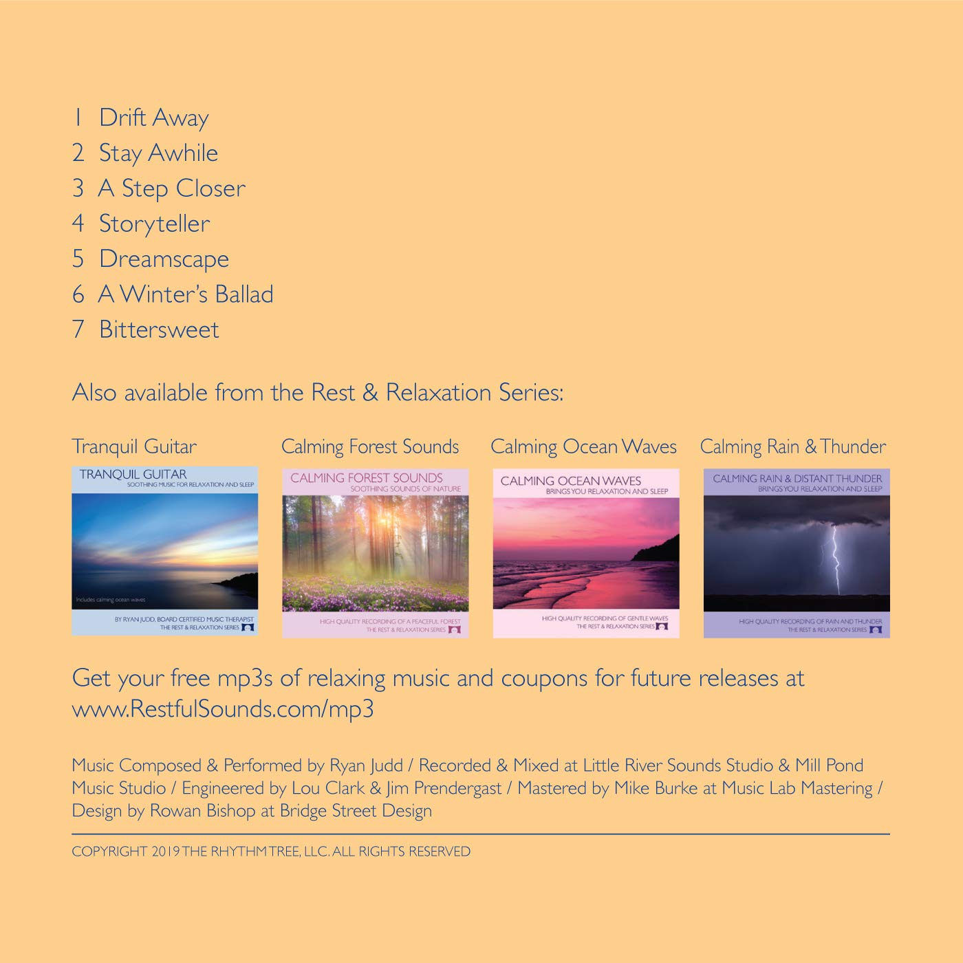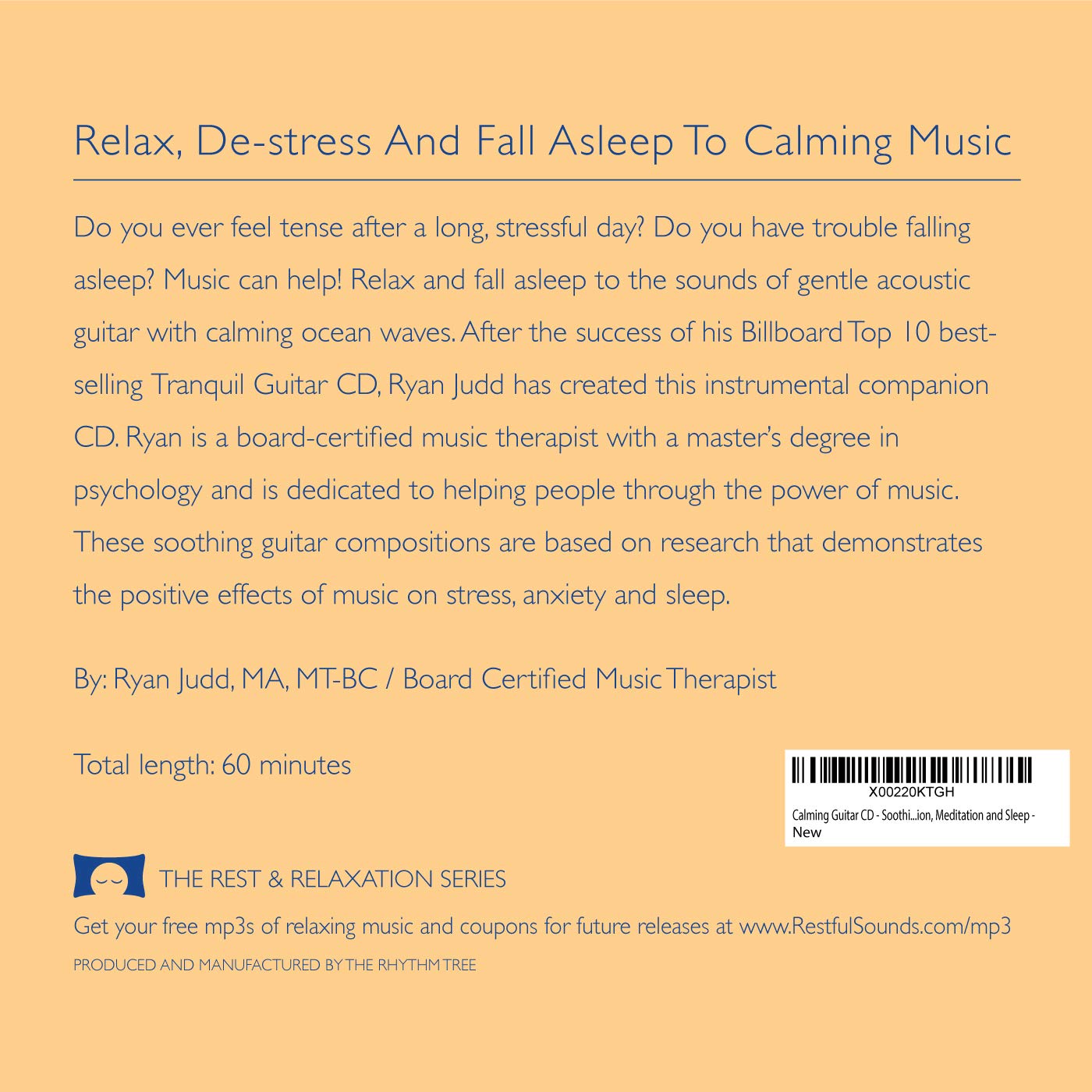 Relax, De-stress And Fall Asleep To Calming Music Feel tense after a long, stressful day? Do you have trouble falling asleep and staying asleep? Relax and sleep to the soothing sounds of gentle acoustic guitar with a calming ocean background with the Calming Guitar CD, a companion CD to the Billboard Top 10, “Tranquil Guitar” CD by Ryan Judd. Composed and recorded by a board certified music therapist with a master’s degree in psychology. The music on this premium-quality CD slowly, gently relaxes you. You’ll feel peace and calm wash over you as tension and stress drain away. You’ll drift into a restful sleep. Plus, you’ll wake up refreshed the next morning. Your CD provides: – Calming fingerstyle guitar music – A serene ocean track that continues throughout the CD and between tracks so there aren’t any breaks between songs. – All of the tracks are played at the rhythm of the resting heart rate – 6-month guarantee: If you don’t love this CD, return it within 6 months of delivery for a full refund – PLUS – A percentage of profits are donated to Lucy’s Love Bus, a non-profit organization that provides FREE music therapy services to pediatric cancer patients in New England. What WON’T You Get? Distractions! Your Calming Guitar CD has no jarring changes in the music. No disruptive breaks between the songs. Nothing but soothing acoustic guitar and waves washing onto the shore. It is a professional, high-quality CD made in the USA and unlike the cheaper CD-R’s this CD will work in all CD players Add to cart now If you love relaxing music – or if you simply crave peace and calm – order this CD right away. Plus, stock up for friends and family who have trouble relaxing or sleeping. Can’t wait for your CD to arrive? Download it now!