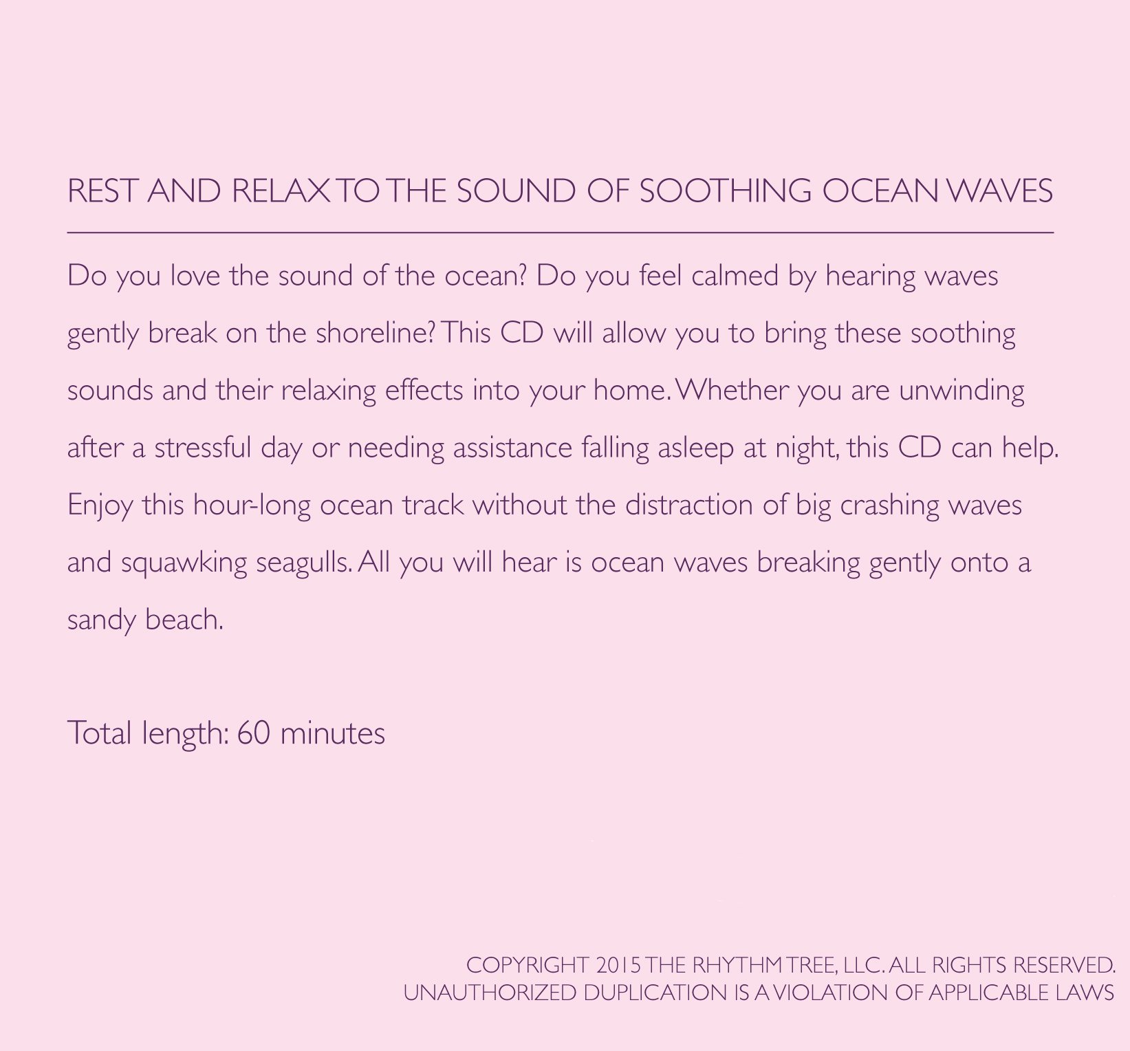 Relax, De-stress Or Fall Asleep To The Rhythmic Sound Of The Waves Feel tense after a long, stressful day? Do you have trouble falling asleep and staying asleep? No need for medications with their unpleasant side effects. Instead, fall asleep to nature’s soothing sounds with the Calming Ocean Waves CD. Your passport to natural sleep The ONLY nature CDs created by a music therapist specializing in the use of sound to help reduce stress and insomnia. This premium-quality CD drowns out external noise as it slowly, gently relaxes you. You’ll feel peace and calm wash over you as tension and stress drain away. You’ll drift into a restful sleep. Plus, you’ll wake up refreshed the next morning – without that groggy feeling you’d get with sleeping meds. Your CD provides: – 60 uninterrupted minutes of real ocean waves breaking gently on the sand – Professional recording quality for crisp, clean audio sound – Protective CD packaging, with a stunning photo of a sunset over a peaceful beach – 6-month guarantee: If you don’t love this relaxing CD, return it within 6 months of delivery for a full refund of your purchase price – Plus – A portion of profits are donated to Lucy’s Love Bus, a non-profit organization that provides free music therapy services to pediatric cancer patients in New England. What won’t you get? Distractions! Your Ocean Waves CD has no jarring background noises. No squawking seagulls. No distracting music. Nothing but calming waves washing onto the shore. It is a professional, high-quality CD made in the USA and unlike the cheaper CD-Rs this CD will work in all CD players Add to cart now If you love the ocean – or if you simply crave peace and calm – order this CD right away. Plus, stock up for friends and family who have trouble relaxing or sleeping. Can’t wait for your CD to arrive? Download it now!