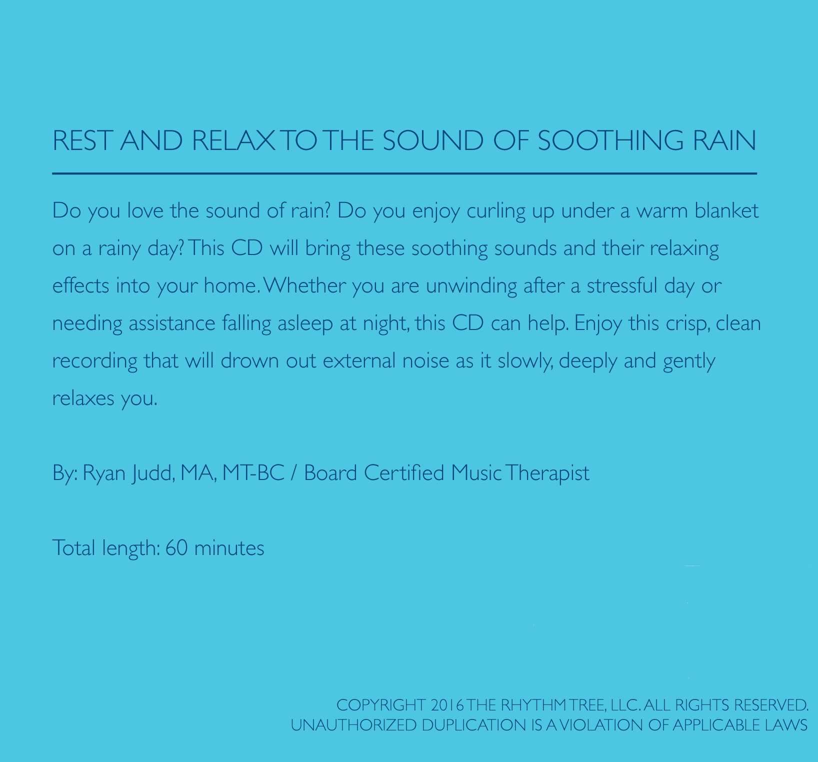 Relax, De-stress Or Fall Asleep To The Soothing Sound Of Rain Feel tense after a long, stressful day? Do you have trouble falling asleep and staying asleep? Relax and fall asleep to the soothing sounds of falling rain with the Calming Rain CD. Authentic recording of rain: your passport to NATURAL relaxation and sleep The ONLY nature CDs created by a therapist specializing in the use of sound to help reduce anxiety, stress and insomnia. This premium-quality CD drowns out external noise as it slowly, gently relaxes you. You’ll feel peace and calm wash over you as tension and stress drain away. You’ll drift into restful sleep. Plus, you’ll wake up refreshed next morning – without that groggy feeling you’d get with sleeping meds. Your CD provides: – 60 uninterrupted minutes of real rain without distracting sounds or annoying loops – Professional recording quality for crisp, clean audio sound – Protective CD packaging, with a lovely photo of an autumn leaf in a pond with falling rain – 6-month guarantee: If you don’t love this relaxing CD, return it within 6 months of delivery for a full refund of your purchase price – PLUS – A percentage of profits are donated to Lucy’s Love Bus, a non-profit organization that provides FREE music therapy services to pediatric cancer patients in New England. What WON’T You Get? Distractions! Your Rain CD has no jarring background noises. No distracting music. No crashing thunder. Nothing but the sound of calming rain. It is a professional, high quality CD NOT made in China and unlike the cheaper CD-R’s this CD will work in all CD players Add to cart now If you love the rain – or if you simply crave peace and calm – order this CD right away. Plus, stock up for friends and family who have trouble relaxing or sleeping. Can’t wait for your CD to arrive? Download it now!