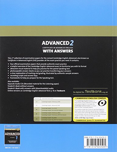 Cambridge English Advanced 2 authentic examination papers provide the perfect preparation tool because they are exactly like the real exam. These examination papers for the Cambridge English: Advanced (CAE) exam provide the most authentic exam preparation available, allowing candidates to familiarise themselves with the content and format of the exam and to practise useful exam techniques. The Student’s Book is also available in a ‘without answers’ edition. Audio CDs (2) containing the exam Listening material and a Student’s Book with answers and downloadable Audio are available separately. These tests are also available as Cambridge English: Advanced Tests 5-8 on Testbank.org.uk