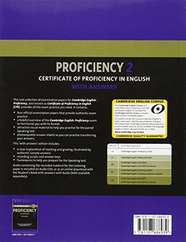 C2 Proficiency 2 authentic examination papers provide the perfect preparation tool because they are exactly like the real exam. This collection of past examination papers provides the most authentic exam preparation available. They allow candidates to familiarise themselves with the content and format of the examination and to practise useful examination techniques. This book contains a clear explanation of marking and grading, authentic sample answers, a comprehensive section of keys and recording scripts, and frameworks to help with thorough preparation for the Speaking test. Audio CDs containing the exam Listening material, a Student’s Book without answers, and a Student’s Book with answers with downloadable Audio are available separately.