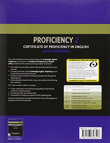 Cambridge English Proficiency 2 contains four complete and authentic examination papers for Cambridge English: Proficiency, also known as Cambridge Certificate of Proficiency in English (CPE). This collection of examination papers provides the most authentic exam preparation available. They allow candidates to familiarise themselves with the content and format of the examination and to practise useful examination techniques. This Student’s Book with answers includes Audio, downloadable from the website. The Student’s Book with answers contains a clear explanation of marking and grading, authentic sample answers, transcripts, and frameworks to help with thorough preparation for the Speaking test. The downloadable Audio files contain the exam Listening material. Audio CDs and a Student’s Book with or without answers are also available separately.