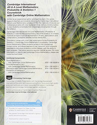 This series has been developed specifically for the Cambridge International AS & A Level Mathematics (9709) syllabus to be examined from 2020. The coursebook provides clear explanations and practice exercises to help students master maths skills. This edition comes with a subscription to the Probability & Statistics 1 Cambridge Online Mathematics component. With all of the materials found within the coursebook, including answers, Cambridge Online Mathematics offers students the facility to demonstrate their working, as well as opportunities for self-assessment, and allows teachers to set classroom and homework exercises to individual students or classes, with the ability to track progress. The online resource requires internet access. For more information on how to use Cambridge Online Mathematics, please see inside the front cover.
