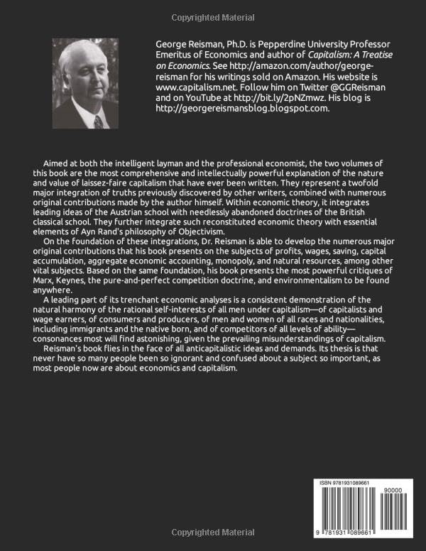 Aimed at both the intelligent layman and the professional economist, the two volumes of this book are the most comprehensive and intellectually powerful explanation of the nature and value of laissez-faire capitalism that has ever been written. They represent a twofold major integration of truths previously discovered by other writers, combined with numerous original contributions made by the author himself. Within economic theory, they integrate leading ideas of the Austrian school with needlessly abandoned doctrines of the British classical school. They further integrate such reconstituted economic theory with essential elements of Ayn Rand’s philosophy of Objectivism. On the foundation of these integrations, Dr. Reisman is able to develop the numerous major original contributions that his book presents on the subjects of profits, wages, saving, capital accumulation, aggregate economic accounting, monopoly, and natural resources, among other vital subjects. Based on the same foundation, his book presents the most powerful critiques of Marx, Keynes, the pure-and-perfect competition doctrine, and environmentalism to be found anywhere. A leading part of its trenchant analyses is a consistent demonstration of the natural harmony of the rational self-interests of all men under capitalism–of capitalists and wage earners, of consumers and producers, of men and women of all races and nationalities, including immigrants and the native born, and of competitors of all levels of ability–consonances most will find astonishing, given the prevailing misunderstandings of capitalism. The book’s importance and appeal to a general audience are evident in its description of prevailing attitudes toward capitalism and its challenge to learn why they are all completely wrong and the cause of self-destructive political behavior on a massive scale. For those with the intellectual courage to accept a challenge of having many of their firmest and most cherished beliefs reduced by unanswerable logic to the status of Dark-Age superstitions, here are some of the beliefs that Reisman’s book demolishes: The profit motive is the cause of starvation wages, exhausting hours, sweatshops, and child labor; of monopolies, inflation, depressions, wars, imperialism, and racism. Saving is hoarding. Competition is the law of the jungle. Economic inequality is unjust and the legitimate basis for class warfare. Economic progress is a ravaging of the planet and, in the form of improvements in efficiency, a cause of unemployment and depressions. War and destruction or additional peacetime government spending are necessary to prevent unemployment under capitalism. Economic activity other than manual labor is parasitical. Businessmen and capitalists are recipients of “unearned income” and are “exploiters.” The stock and commodity markets are “gambling casinos”; retailers and wholesalers are “middlemen,” having no function but that of adding “markups” to the prices charged by farmers and manufacturers; advertisers are inherently guilty of fraud–the fraud of attempting to induce people to desire the goods that capitalism showers on them, but that they allegedly have no natural or legitimate basis for desiring. Reisman’s book flies in the face of all anticapitalistic ideas and demands. Its thesis is that never have so many people been so ignorant and confused about a subject so important, as most people now are about economics and capitalism. It argues that in its logically consistent form of laissez-faire capitalism–that is, with the powers of government limited to those of national defense and the administration of justice–capitalism is a system of economic progress and prosperity for all, and is a precondition of world peace. Following an exhaustive economic analysis of virtually every aspect of capitalism, the book’s concluding chapter is devoted to the presentation of a long-range political-economic program for the achievement of a fully capitalist society.