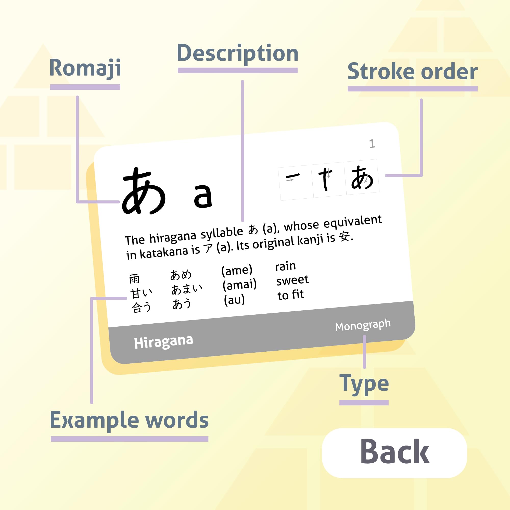 INFORMATIVE: One side displays a character, the other side displays its Romaji, stroke-order diagrams, Katakana equivalent and common words, 317 words in total. Item includes the table of Hiragana sheet for your easy reference.