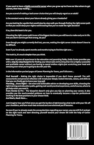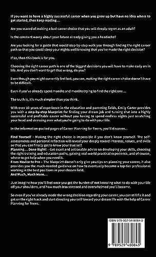 3 FREE BONUSES WITH YOUR PURCHASE Everything Your Teen Needs to Find Their Path and Turn That Into a Successful and Fulfilling Career… All in One Book! The Perfect Gift for Teen Boys and Girls From Ages 12-19 Years Old Do you want to help your teenager find themselves and make the right career choice early on in their life? Or has your teenager already shown signs of being scared of making a bad career choice that they would deeply regret as an adult? Or are you simply looking for a guide that would step-by-step walk your teen through finding the right career path so that they could sleep nights well knowing that they’ve made the right decision? If so, then this book is for you. Choosing the right career path is one of the biggest decisions teens will have to make early on in life. And you don’t want them to get that wrong, do you? Even though they might currently feel lost, you see, making the right career choice doesn’t have to be difficult or exhaustive. Even if you’ve already spent months and months trying to find the right one together… The truth is, it’s much simpler than you think. With over 10 years of experience in the education and parenting fields, Emily Carter provides your teen with a step-by-step blueprint for finding their dream job and turning that into a highly successful and profitable career without having to spend endless nights just scratching their head and stressing over what they’re going to do with their life. Here’s just a fraction of what you will discover in Career Planning for Teens: An incredibly effective self-assessment that will finally reveal your teen’s true self (And their hidden talents!) A Simple step-by-step process to finding the profession that suits your teen the best A 3-step process to developing your skillset to become the best candidate on the job market A guaranteed way to get help when your teen needs it the most Planning your teen’s education the RIGHT way so that you neither waste time nor money How to gain highly-valued practical experience already as a teen even if they cannot get a job Finally, land the dream job and turn that into a highly successful career And of course, much, much more… And as a COMPLEMENTARY BONUS, you will receive THREE EBOOKS: “Unleashing Your Potential”: A Teenager’s Guide to Developing a Growth Mindset and Opening Your Path to Success “The Essential Summer Job Handbook”: The Teen’s Guide to a Fun and Profitable Summer “Raising Teens With Confidence”: 10 Exclusive Blog Posts on Parenting Teens Since getting teenagers to read books isn’t necessarily the easiest task, this book has been designed to be fun, interesting and engaging for your teen. This is not just a textbook. This is a guide they will really enjoy picking up and reading. Just imagine how your teenager will feel once they get the burden of not knowing what to do with their life off their shoulders, and how much less stressed and overwhelmed they’ll become. So even if your teen has already made the wrong decision regarding their career, you can still fix it, get on the right track and start directing them toward their dream life with the help of Career Planning for Teens. Don’t let your teen’s future be left to chance. Invest in their success, and in turn, your peace of mind. The time for confident decision-making is now, and this book is the key to unlocking that potential. If you want to help your teen make the RIGHT career choice and turn that into a success, scroll up and click the “Add to Cart” button to order your copy now!