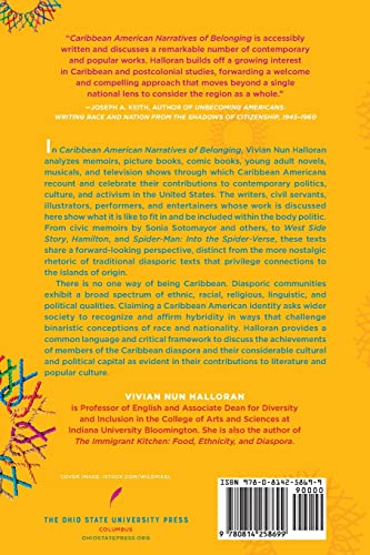 In Caribbean American Narratives of Belonging, Vivian Nun Halloran analyzes memoirs, picture books, comic books, young adult novels, musicals, and television shows through which Caribbean Americans recount and celebrate their contributions to contemporary politics, culture, and activism in the United States. The writers, civil servants, illustrators, performers, and entertainers whose work is discussed here show what it is like to fit in and be included within the body politic. From civic memoirs by Sonia Sotomayor and others, to West Side Story, Hamilton, and Into the Spider-Verse, these texts share a forward-looking perspective, distinct from the more nostalgic rhetoric of traditional diasporic texts that privilege connections to the islands of origin. There is no one way of being Caribbean. Diasporic communities exhibit a broad spectrum of ethnic, racial, religious, linguistic, and political qualities. Claiming a Caribbean American identity asks wider society to recognize and affirm hybridity in ways that challenge binaristic conceptions of race and nationality. Halloran provides a common language and critical framework to discuss the achievements of members of the Caribbean diaspora and their considerable cultural and political capital as evident in their contributions to literature and popular culture.