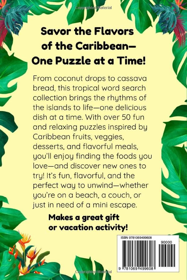 Craving a taste of the islands? Get whisked away to the Caribbean–no plane ticket required! Caribbean Eats Word Search is a fun and flavorful puzzle adventure inspired by beloved dishes, tropical treats, and island snacks. Whether you’re a longtime fan of Caribbean cuisine or just discovering new favorites, each puzzle offers a taste of something delicious. It’s the perfect screen-free escape–and makes a joyful gift for foodies, travelers, and puzzle lovers of all ages. This puzzle book features: * 55 word search puzzles inspired by real Caribbean foods * Easy-to-read layouts with 3-column word lists * Tasty themes like fruits, desserts, savory dishes & snacks * Suitable for adults, teens, and older kids * Puzzle solutions included at the back * Compact 6 x 9 inch size–ideal for travel, beach days, or cozy nights in * Great for road trips, flights, stay-cations, or quiet moments anywhere * A fun gift for food lovers, island dreamers, or anyone who’d love a Caribbean-flavored brain break–minus the jet lag Relax, unwind, and savor the flavor of the islands–one word at a time.