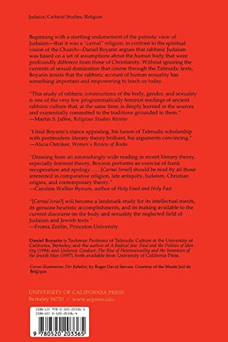 Beginning with a startling endorsement of the patristic view of Judaism–that it was a “carnal” religion, in contrast to the spiritual vision of the Church–Daniel Boyarin argues that rabbinic Judaism was based on a set of assumptions about the human body that were profoundly different from those of Christianity. The body–specifically, the sexualized body–could not be renounced, for the Rabbis believed as a religious principle in the generation of offspring and hence in intercourse sanctioned by marriage. This belief bound men and women together and made impossible the various modes of gender separation practiced by early Christians. The commitment to coupling did not imply a resolution of the unequal distribution of power that characterized relations between the sexes in all late-antique societies. But Boyarin argues strenuously that the male construction and treatment of women in rabbinic Judaism did not rest on a loathing of the female body. Thus, without ignoring the currents of sexual domination that course through the Talmudic texts, Boyarin insists that the rabbinic account of human sexuality, different from that of the Hellenistic Judaisms and Pauline Christianity, has something important and empowering to teach us today.