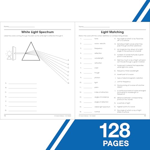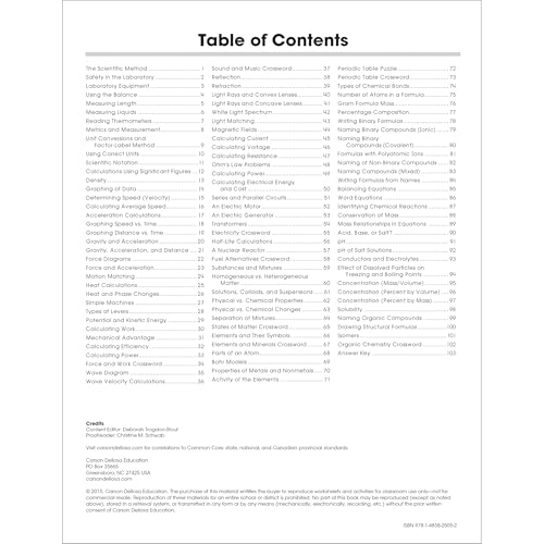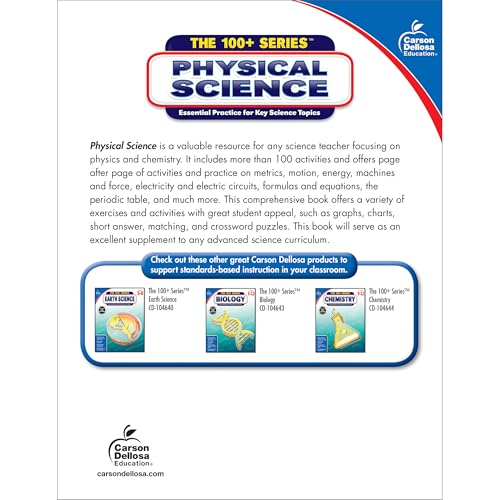 SCIENCE MATTERS: The 100+ Series Physical Science Workbooks for grades 5-12 provides your students with the reinforcement they need to learn and retain the knowledge taught in high school. With fascinating puzzles and problems, this book is a great extension for physics and chemistry units. AN ANYWHERE RESOURCE: This workbook is the perfect skill-building resource for both home and school! This book is designed to aid in the review and practice of physical science topics. INCLUDES: Offering page after page of activities and practice on metrics, motion, energy, machines and force, electricity and electric circuits, formulas and equations, the periodic table, and much more, this comprehensive book features a variety of exercises and activities with great student appeal. It will serve as an excellent supplement to any advanced science curriculum. THE 100 SERIES: For decades, the 100+ series has been a favorite resource among teachers for daily review and reinforcement. Each title features in-depth practice activities for key subject area skills. It’s the perfect skill-building resource at home or in school! WHY CARSON DELLOSA: As the market-leading provider of children’s supplemental educational products, we’ve been bridging school and home with innovative solutions for teachers and families for more than 40 years.