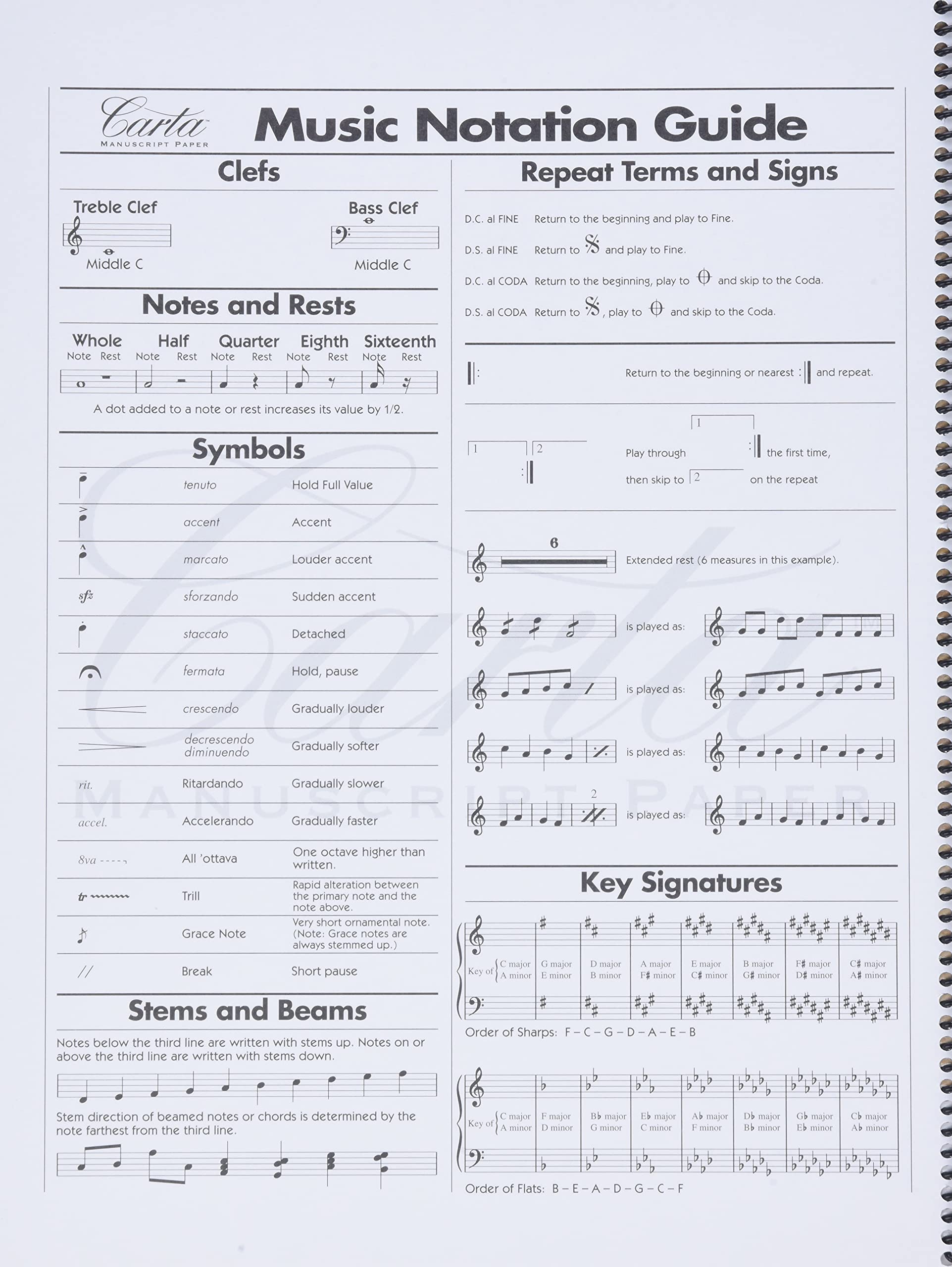 A Versatile Music Manuscript Book for All Musicians. * The Carta Manuscript Paper No. 9 is a reliable companion for composers, students, and music teachers alike. With 96 spiral-bound pages measuring 9 x 12 inches, this notebook provides ample space for notating melodies, chords, and full compositions in an organized layout. * * Designed for Clarity and Ease of Use. * Featuring 12 clear staves per page and a built-in Music Notation Guide, this music staff notebook helps beginners and advanced musicians alike maintain clean and consistent writing. The spiral binding ensures the pages lie flat, making it ideal for desks, pianos, or music stands. * * Perfect for Study, Practice, or Classroom Use. * Whether you’re writing original compositions, arranging for instruments, or completing theory assignments, this book is built for everyday use. It’s a great music teacher resource and an excellent gift for pianists, songwriters, or students learning notation by hand. * * Stay organized and inspired with this durable and thoughtfully designed sheet music workbook.