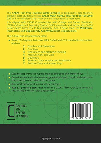 CASAS Math GOALS Textbook Form 917 M Level C/D This CASAS Test Prep student math textbook is designed to help teachers prepare adult students for the CASAS Math GOALS Test Form 917 M Level C/D and for workforce and vocational training entrance math tests. The content of this textbook is aligned with CASAS Competencies, with College and Career Readiness (CCR) and National Reporting System (NRS) standards and follows the CASAS GOALS Math Form 917 M test blueprint. This textbook presents learning activities that help adult education programs, workforce programs, and their adult students to meet the Workforce Innovation and Opportunity Act (WIOA) math expectations. This CASAS test prep textbook offers Seven (7) main chapters that cover NRS, CASAS and CCR standards and content such as 1- Number and Operations 2- Fractions 3- Operations and Algebraic Thinking 4- Measurement and Data 5- Geometry 6- Statistics, Data Analysis and Probability 7- Practice Tests and Answer Keys The textbooks offers step-by-step instruction, plus practice exercises and answer keys. The questions and tasks that encourage pair work, group work, and classroom discussion on math ideas and concepts, real world word problems and key concepts. The two (2) practice tests that mimic the CASAS Math GOALS Form 917 M test format and rigor, plus answer keys The word problems presented in this textbook aim to 1) Make learners think more deeply about math structure and concepts and therefore improve their mathematical thinking skills, 2) Provide learners with hands-on tasks relevant to their situation, 3) Help learners connect their math learning with the real world, 4) Create opportunities for learners to read about, write about, and discuss math ideas and concepts and 5) Invite learners to reflect on their learning.