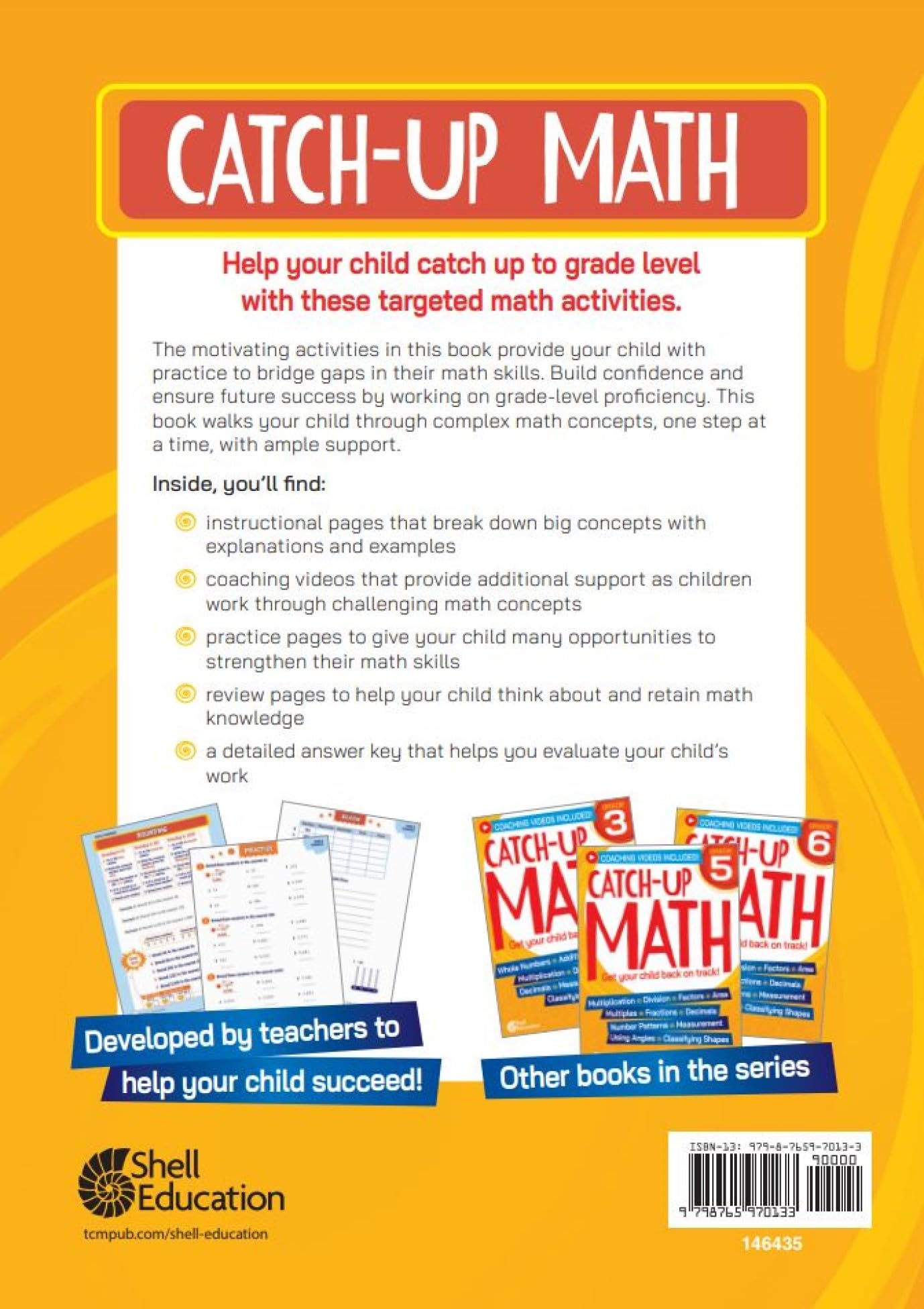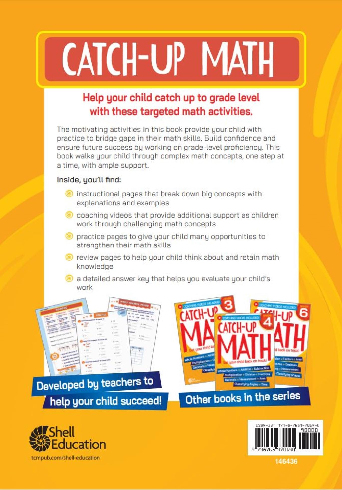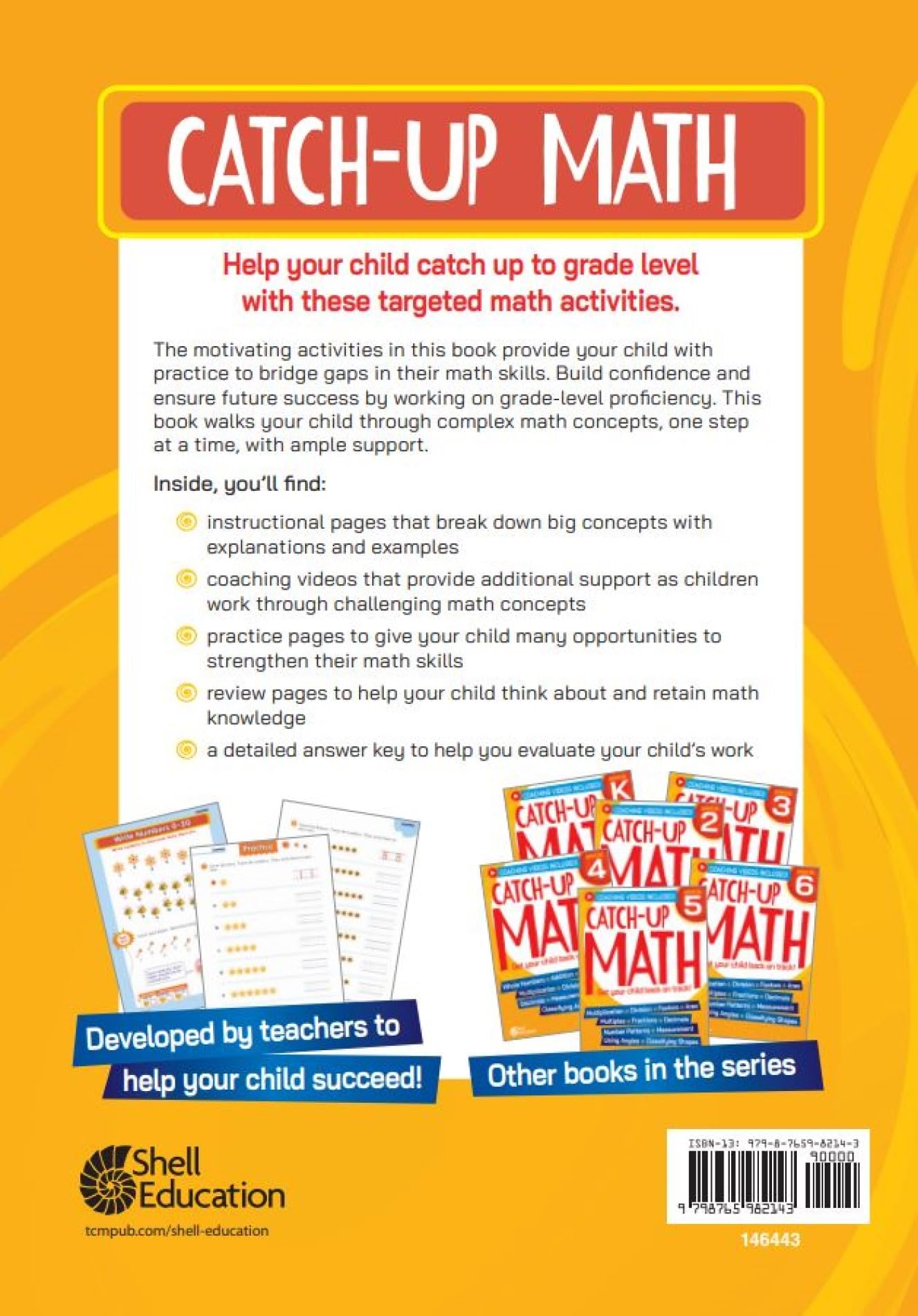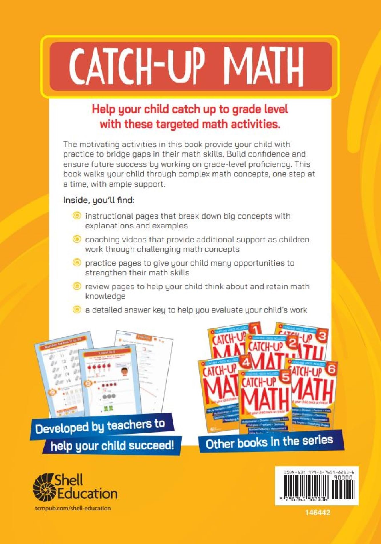 The Ultimate Math Catch-Up Set. This 7-Book Set includes one book per grade beginning with Kindergarten. Families appreciate that these full-color books offers simple step-by-step explanations of each topic and includes access to instructional videos created by math experts. The examples and practice activities help students master grade-level math concepts such as division, fractions, and angles. In addition, the review pages cement foundational mathematics skills, ensuring that students are ready to tackle more difficult math concepts going forward. Each Grade Level Book in the Set includes: Instructional pages that explain key math concepts Units on whole numbers, addition, subtraction, multiplication, division, fractions, decimals, patterns, length, angles, shapes, area, capacity, mass, and time Examples, practice, and reviews of each topic Coaching videos to help students understand challenging topics Answers to all questions so families can monitor student growth