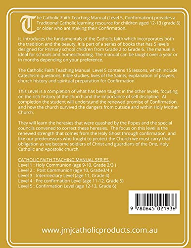 he Catholic Faith Teaching Manual (Level 5, Confirmation) provides a Traditional Catholic learning resource for children aged 12-13 (grade 6) or older who are making their Confirmation. It introduces the fundamentals of the Catholic faith which incorporates both the tradition and the beauty. It is part of a series of books that has 5 levels designed for Primary school children from Grade 2 to Grade 6. The manual is ideal for schools and homeschooling. The manual can be taught over a year or in months depending on your preference.The Catholic Faith Teaching Manual Level 5 contains 15 lessons, which include Catechism questions, Bible studies, lives of the Saints, explanation of prayers, church history and spiritual preparation for Confirmation.This Level is a completion of what has been taught in the other levels, focusing on the rich history of the church and the importance of self discipline. At completion the student will understand the renewed promise of Confirmation, and how the church survived the dangers from outside and within Holy Mother Church. They will learn the heresies that were quashed by the Popes and the special councils convened to correct these heresies. The focus on this level is the renewed strength that comes from the Holy Ghost through confirmation, and like our predecessors who fought to protect the Church we must carry that obligation as we become soldiers of Christ and guardians of the One, Holy Catholic and Apostolic church. CATHOLIC FAITH TEACHING MANUAL SERIES Level 1 : Holy Communion (age 9-10, Grade 2/3 )Level 2 : Post Communion (age 10, Grade3/4 )Level 3 : Intermediary Level (age 11, Grade 4)Level 4 : Pre confirmation Level (age 11-12, Grade 5)Level 5 : Confirmation Level (age 12-13, Grade 6)www.jmjcatholicproducts.com.au