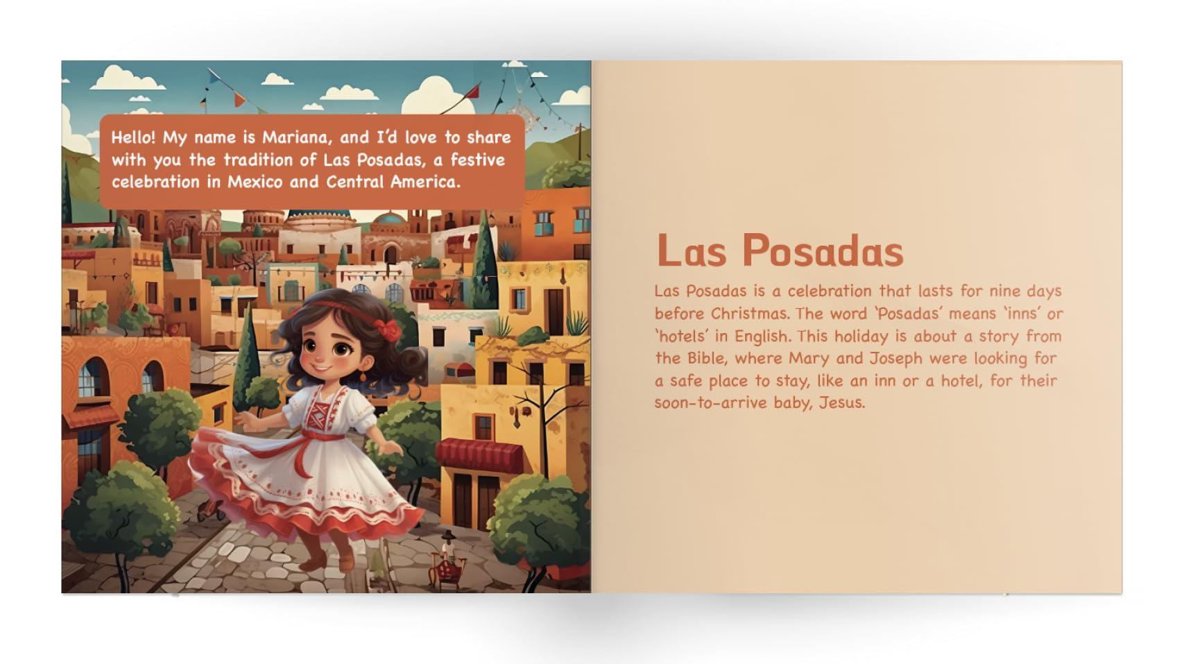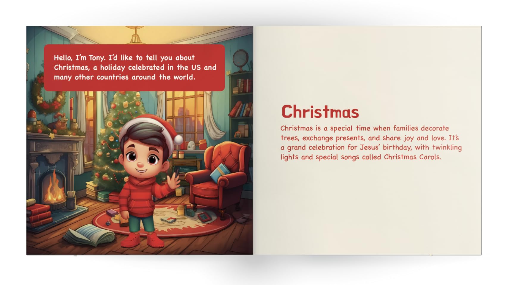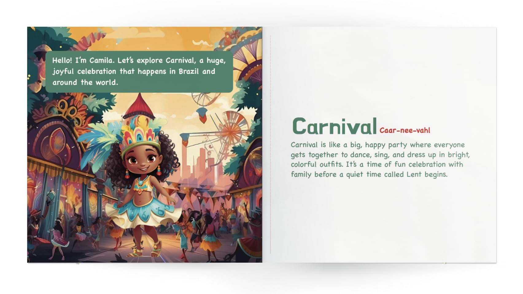 Join the festive journey in “Celebrations Around the World,” where every page turn is a party and every story is a slice of life from a different corner of the globe. Written for the curious minds of children aged 2-10, this enchanting book celebrates the rich and joyful diversity of festivals from around the world. Meet our little guides: Tony, Maya, Nina, Syed, Camila, and Mariana. These vibrant youngsters are your children’s companions as they explore the sparkling traditions of Diwali, the heartfelt gatherings of Ramadan, the festive cheer of Christmas, the rhythmic dances of Carnival, and the close-knit rituals of Las Posadas. Inside this magical tour: Personal stories from kids who celebrate these festivals, offering a genuine glimpse into their traditions and what makes each day special. Beautiful, vivid illustrations that bring the stories to life and keep young readers engaged. Fun and educational activities related to each festival to involve kids in learning through play. Simple and accessible language perfect for early readers or for storytime with family or in the classroom. Cultural insights that teach respect, appreciation, and the beauty of our world’s diverse ways of celebrating. Educational Alignment: “Celebrations Around the World” is an educational tool aligned with: Common Core State Standards (CCSS) to develop critical thinking and comprehension skills. National Association for the Education of Young Children (NAEYC) to foster language and literacy from a young age. Head Start Early Learning Outcomes Framework to encourage a strong sense of community and cultural respect.