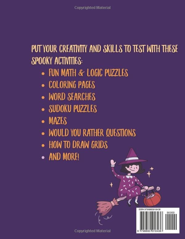 This Halloween-themed activity book for kids 8-12 combines fun and skill-building by including: Fun Math & Logic Puzzles Coloring Pages Word Searches Sudoku Puzzles Mazes Would You Rather Questions How to Draw Grids And More! The activities in this book challenge kids to practice the following math & logic skills: Simple arithmetics (adding, subtracting, multiplication, division), Measurement conversion Attention to details Verbal Reasoning