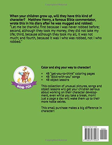 Kids can color and sing their way to more noble character! This book uses New International Version memory verses. You get 48 “get-you-to-think” coloring pages, large-print lyrics of 48 “stick-with-you” songs, and 48 object lessons to drive each point home. 97 pages. This softcover letter-size book contains pictures of animals and words that actually look and act like the trait they describe. Includes a memory verse for each character trait (New International Version; see the other ordering option, using King James Version). Each song is a catchy advertisement for maximum ways of doing things and relating to people. Contagious, foot-tapping powerful one-liners, ready to grab when you need them most in life, about determination, grumbling, gratefulness, joyfulness, love, procrastination, etc. Just the kind of catchy ads you want your kids to sing! Get double use of the follow-along song words for character training while your children use them for practicing their typing or penmanship, too. [NOTE:The songs audio CD is 58 minutes and is NOT included in the book; order it directly from homeschoolhowtos.com.)