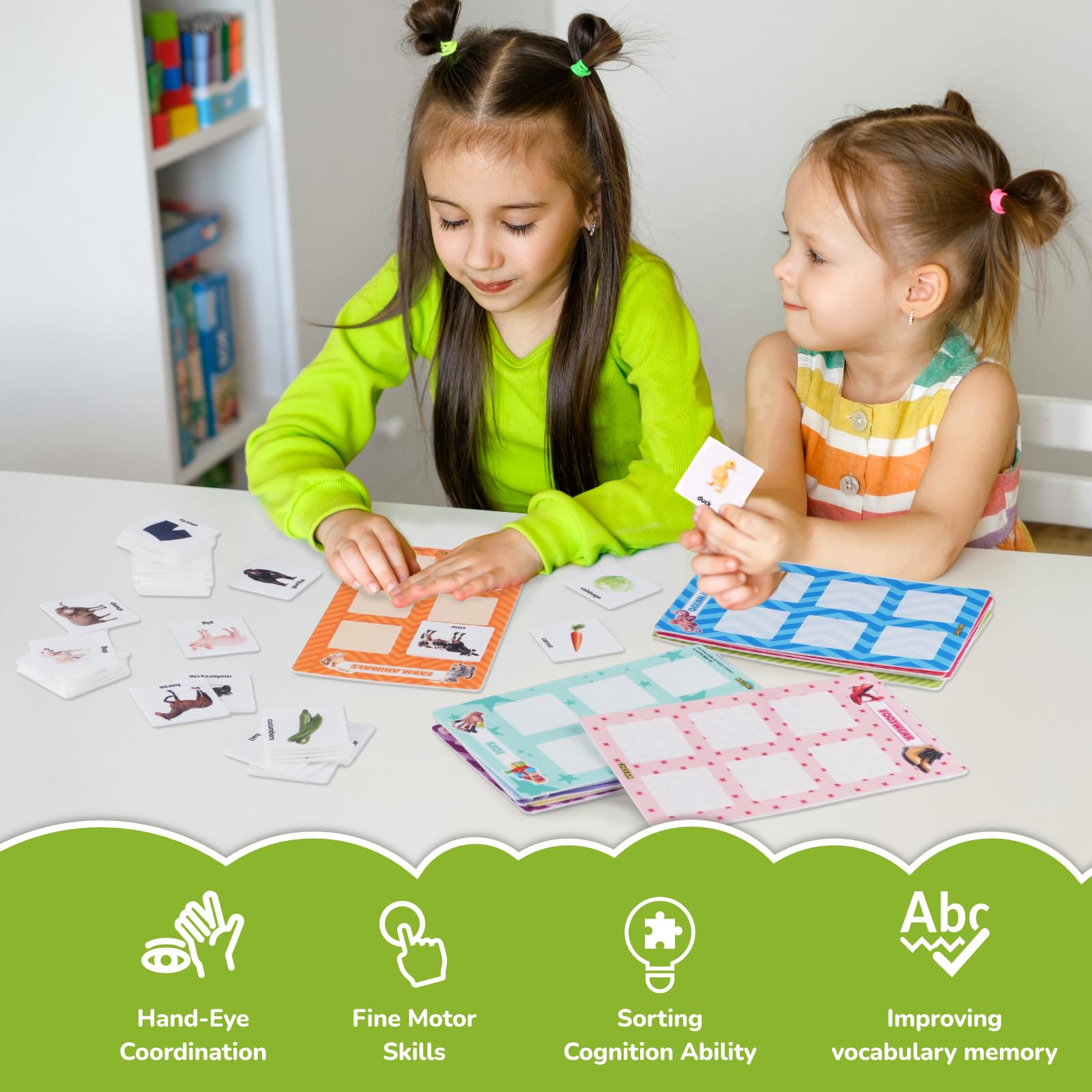 - Fun Sorting Game: These sorting activity cards combine learning and play, guiding children to sort animals and objects according to their attributes and characteristics, helping them learn more about animals, transportation, food, body parts, and other everyday knowledge, and improving their cognitive and fine motor skills