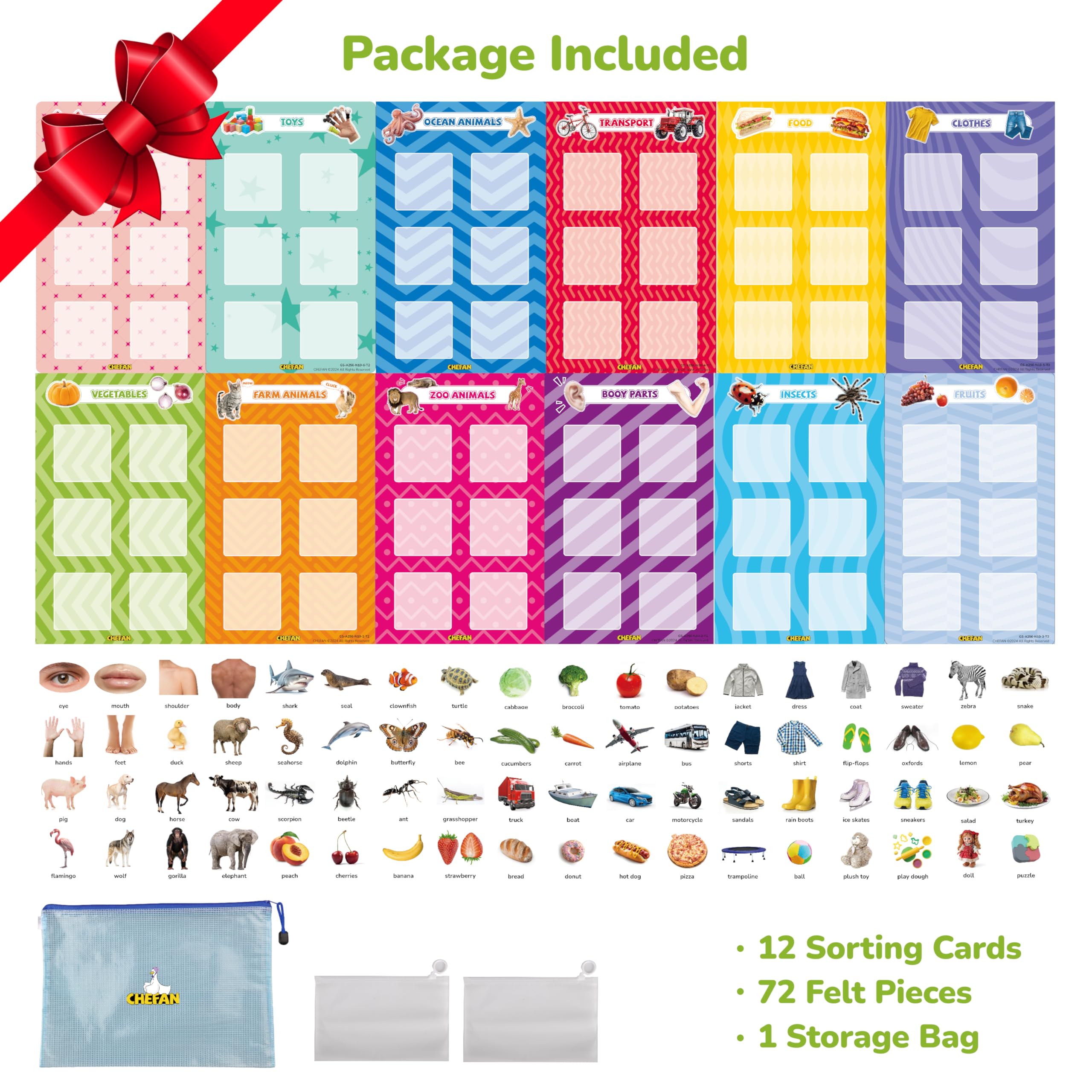 - 12 Themed Sorting Toys: including 12 sorting cards, 6 Fruits, 6 Vegetables, 6 Transports, 6 Insects, 6 Toys, 6 Foods, 6 Clothes, 6 Footwears, 6 Body Parts, 6 Zoo Animals, 6 Farm Animals,6 Ocean Animals,3 Storage Bags,Fun Sorting Game for Kids to develop kids’ sorting and matching skills.