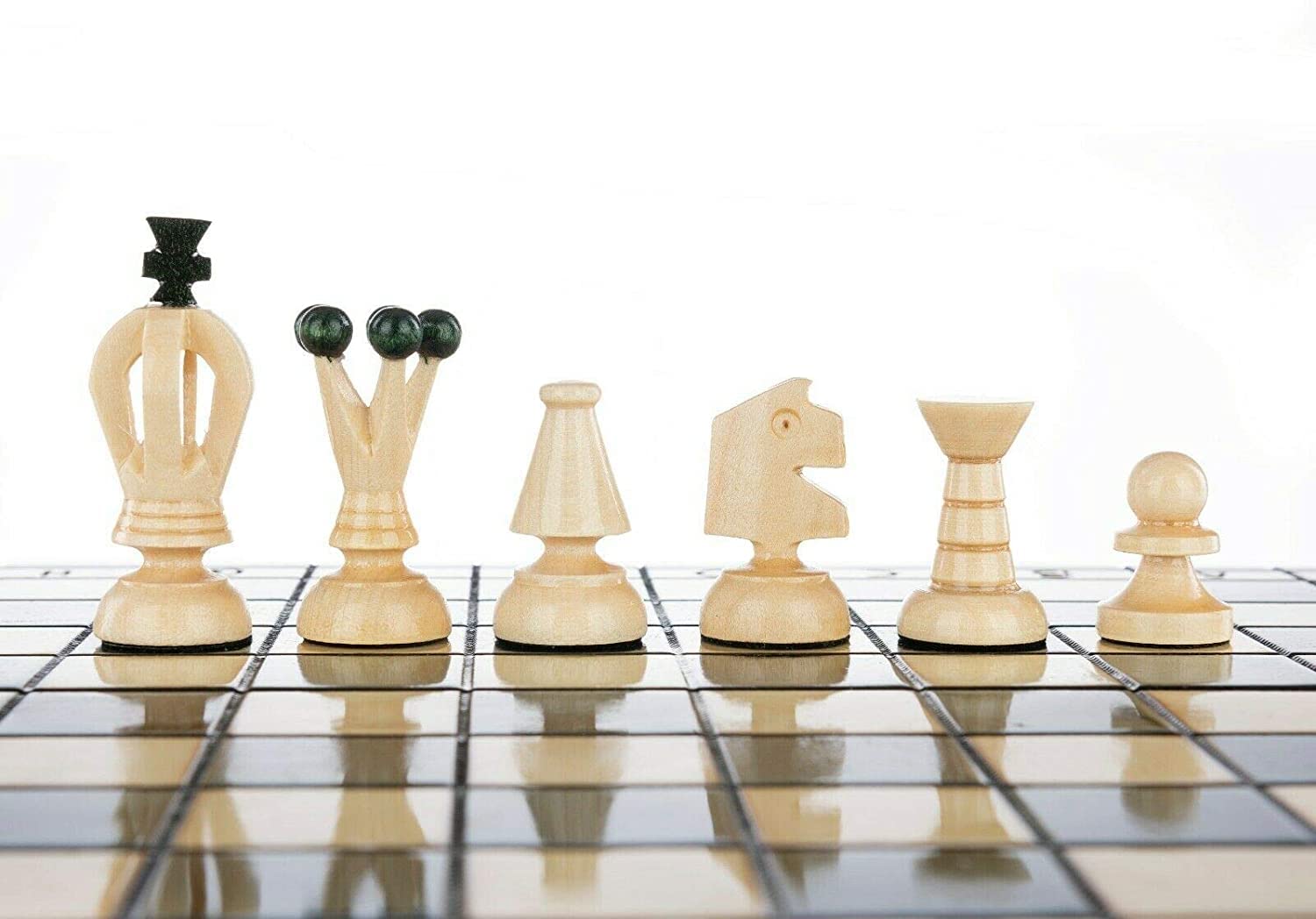 Chess made of hornbeam wood Painted on half-mat Cassette size: 31 cm x 15,5 cm / 12.5″ x 6″ King height: 66 mm / 2,6″ Pawn height: 33 mm / 1,3″ Insert tray for pieces Folding wooden board Beautiful design