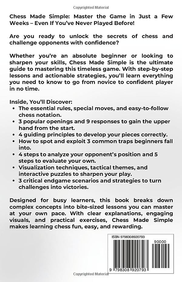 Chess Made Simple: Learn the Game in Just a Few Weeks – No Experience Needed! Think chess is too complicated? Think again! This easy-to-follow guide will have you playing with confidence–and winning more games–faster than you ever imagined. Do you admire the strategic brilliance of great chess players but don’t know where to start? Have you ever wanted to confidently challenge friends, family, or online opponents without feeling lost? If you answered yes, then Chess Made Simple is the perfect guide for you! Chess isn’t just for geniuses–it’s a game of logic, patience, and simple strategies that anyone can learn. This book breaks down the essentials into fun, practical lessons designed specifically for beginners. Whether you’ve never touched a chessboard or want to sharpen your basics, this book will fast-track your skills and help you confidently play at an 800 Elo level or beyond. Inside, You’ll Discover: * Master the Basics: Learn the rules and special moves like castling, en passant, and pawn promotion. * Chess Notation Simplified: Understand the symbols and how to read chess moves with ease. * Strategic Thinking: Build critical thinking with interactive exercises that improve decision-making. * black pawn Opening Strategies: Learn 3 powerful openings and 9 smart responses to take early control. * Principles of Development: Follow 4 golden rules to develop your pieces efficiently and safely. * Tactics & Traps: Recognize 3 common traps and how to avoid–or use–them to your advantage. * Anticipate Like a Pro: Use 3-step visualization techniques to stay several moves ahead. * Positional Awareness: Analyze your opponent’s and your own position with simple, repeatable steps. * Endgame Mastery: Win with confidence using 3 endgame scenarios and winning tactics. * Growth On & Off the Board: Enjoy puzzles and challenges while using chess to enhance real-life decision-making. No Time? No Problem! This book is built for busy people–breaking down complex ideas into quick, bite-sized lessons you can digest at your own pace. With clear visuals, relatable examples, and step-by-step walkthroughs, you’ll be making smarter moves–and seeing your rating climb toward 800 Elo–before you know it. Ready to become the confident chess player you’ve always wanted to be? Scroll up and click “Add to Cart” now to start your journey to 800 Elo–and beyond!