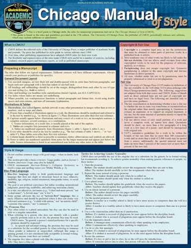 Get the guidance you need quickly with the Chicago Manual of Style QuickStudy(r) guide. Based on the 17th edition of CMS, this handy 6 page laminated guide covers the essentials of this often mandatory style for academic research papers, business reports and published manuscripts. Expertly authored using 25 plus years of experience in editing, academics, business and publishing, it covers aspects of the style necessary for most papers and publications and includes common, real-world sample references for both CMS citation formats so that you can be sure you are giving appropriate credit where credit is due. Add this inexpensive tool to your resources for another way to reinforce your CMS knowledge and ensure your writing is not clouded by incorrect usage that might affect your reader, especially your professors where a grade might be affected. 6 page laminated guide includes: Preparing a Manuscript Copyright & Fair Use Style & Usage Bias-Free Language Punctuation Style & Usage Lists Capitalization Numbers Abbreviations & Acronyms Quotations Documentation Source Citation Overview The Author-Date System The Notes & Bibliography System Sample References Tricky Words An Introduction to Grammar