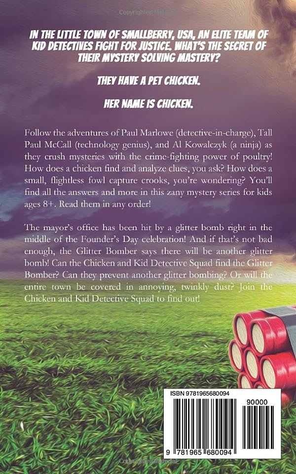 In the quirky town of Smallberry, USA, three kid detectives have a secret weapon that cracks every case… They have a pet chicken. Her name is Chicken. When a mysterious Glitter Bomber attacks the mayor’s office during the Founder’s Day celebration, chaos erupts! With a threat of more sparkly strikes looming, the town turns to its most unusual crime-fighting team: Paul Marlowe: Kid detective-in-charge Tall Paul McCall: Technology whiz who can hack anything Al Kowalczyk: Martial arts master and master of disguise Chicken: The feathered sleuth with surprising crime-solving abilities! How does one chicken outthink criminal masterminds? Can this squad of young detectives stop the Glitter Bomber before Smallberry drowns in a sea of sparkles? Discover the hilarious truth in this laugh-out-loud mystery adventure! This short children’s novel is perfect for readers 8 and up who love mysteries with a side of silly. Books in the Chicken and Kid Detective Squad series can be read in any order.