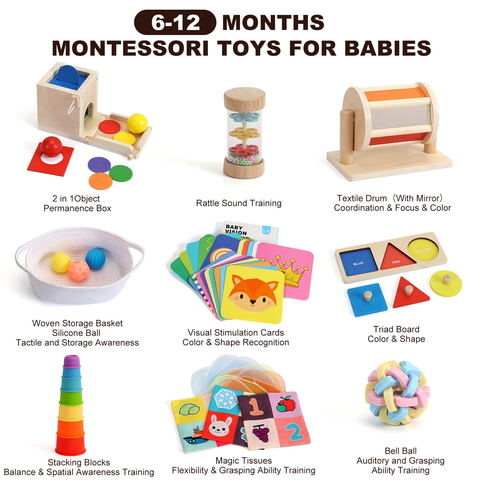 - [(The Perfect Gift for Any Occasion)] Searching for an unforgettable gift? Our 10-in-1 Montessori toy set comes beautifully packaged, making it the ideal choice for baby showers, birthdays, holidays, or any special moment. Thoughtfully designed for babies aged 6-12 months, this sensory-rich set combines fun, education, and lasting memories–guaranteed to bring big smiles and spark curiosity. Give the gift of learning and watch your little one thrive with this exceptional toy collection!