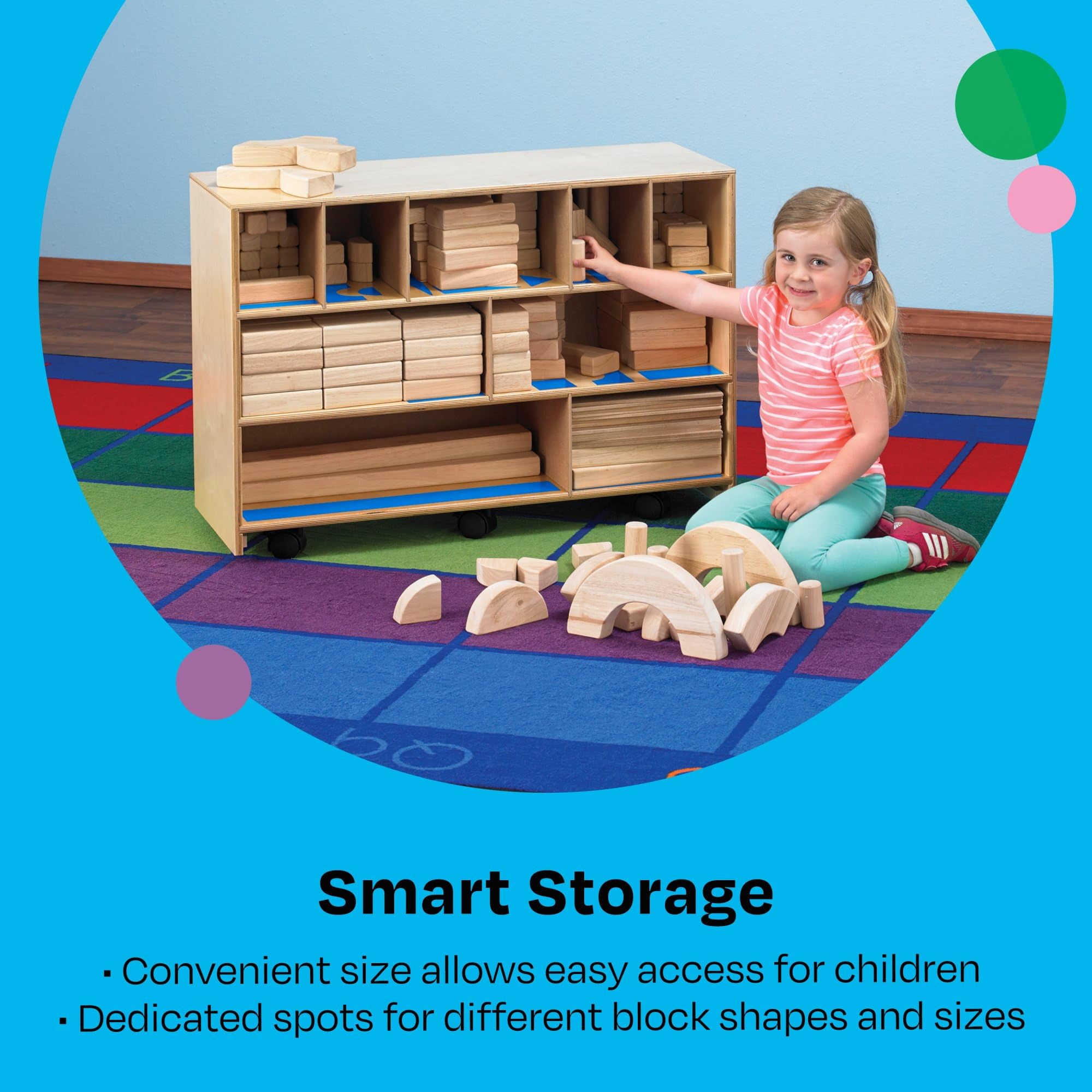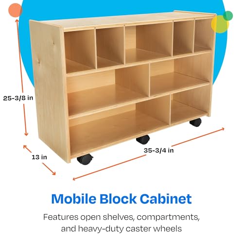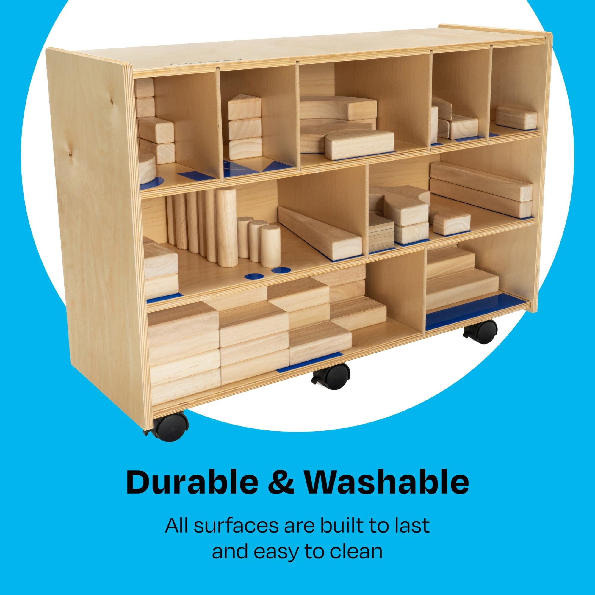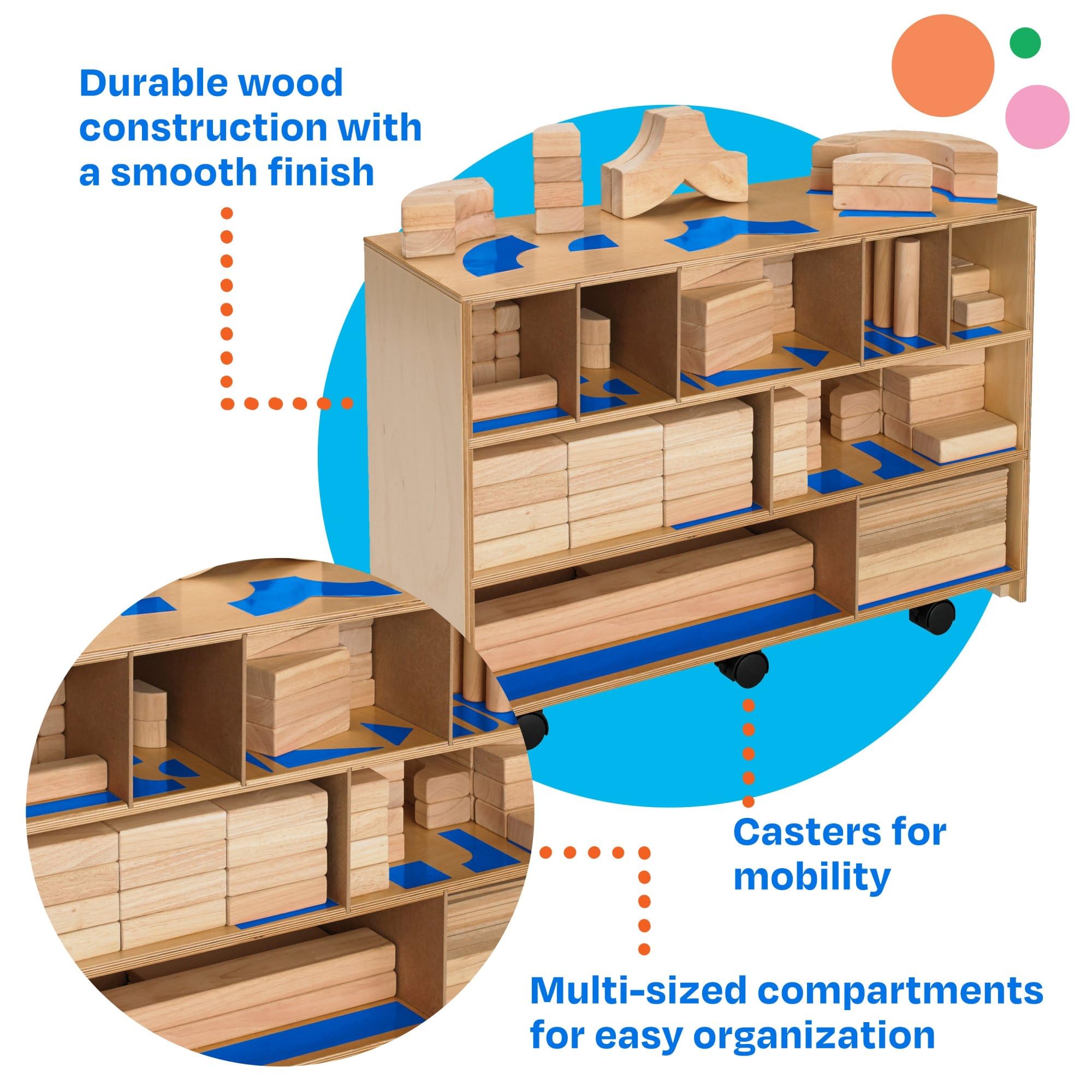 - Child-Safe*: Keep building blocks organized in classrooms with this mobile storage cabinet. The wooden cabinet features wheels, open shelves, and multiple compartments for easy toy organization.