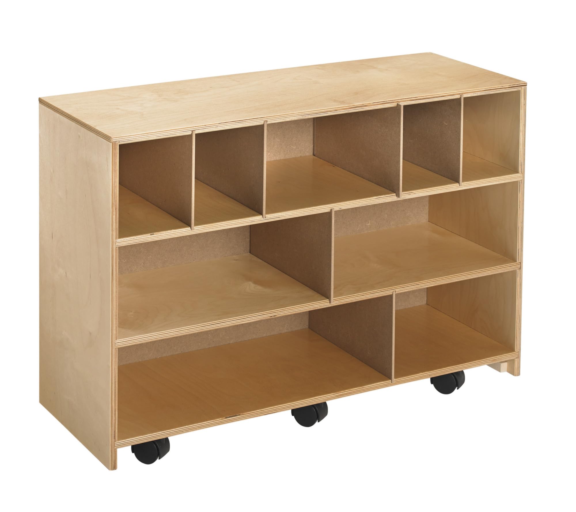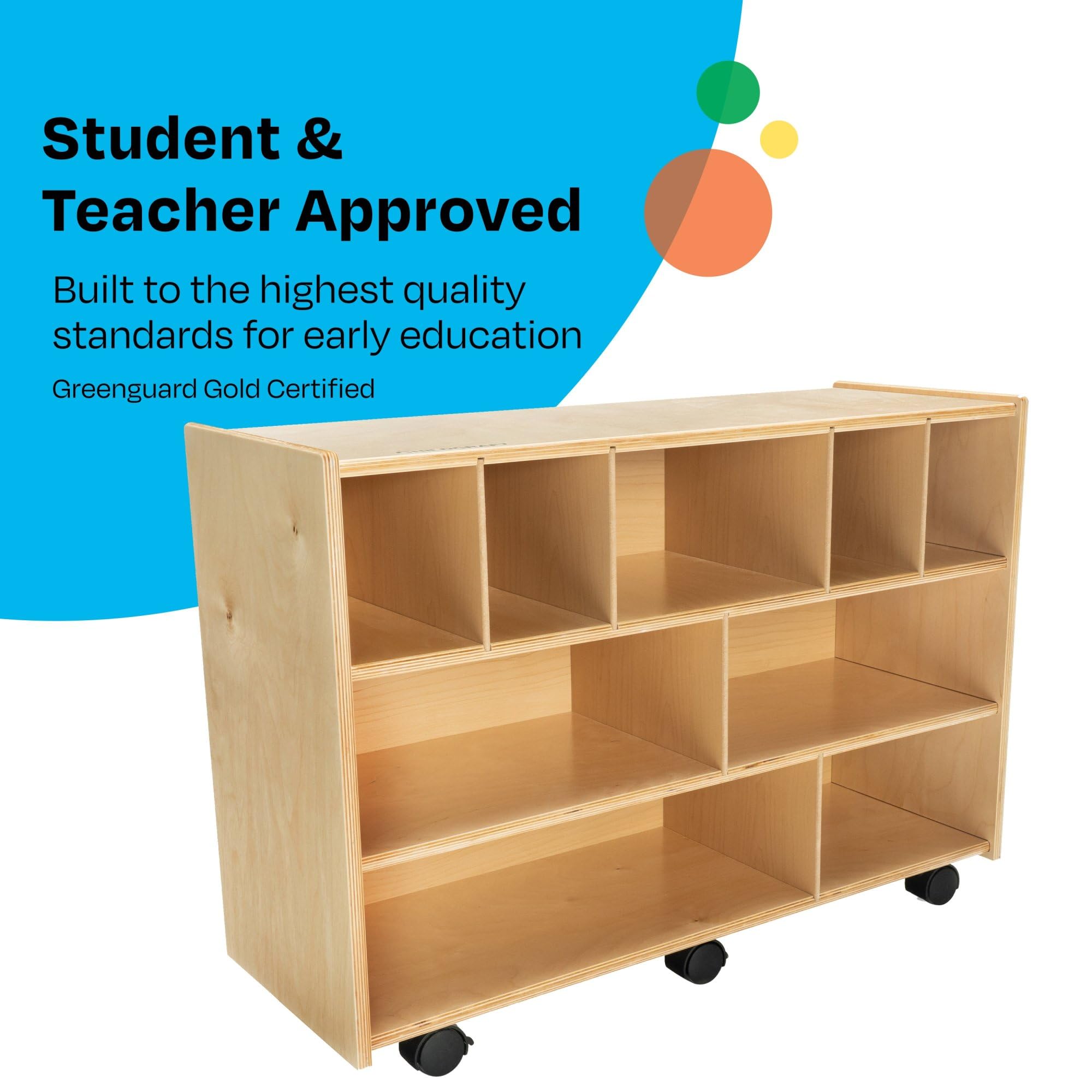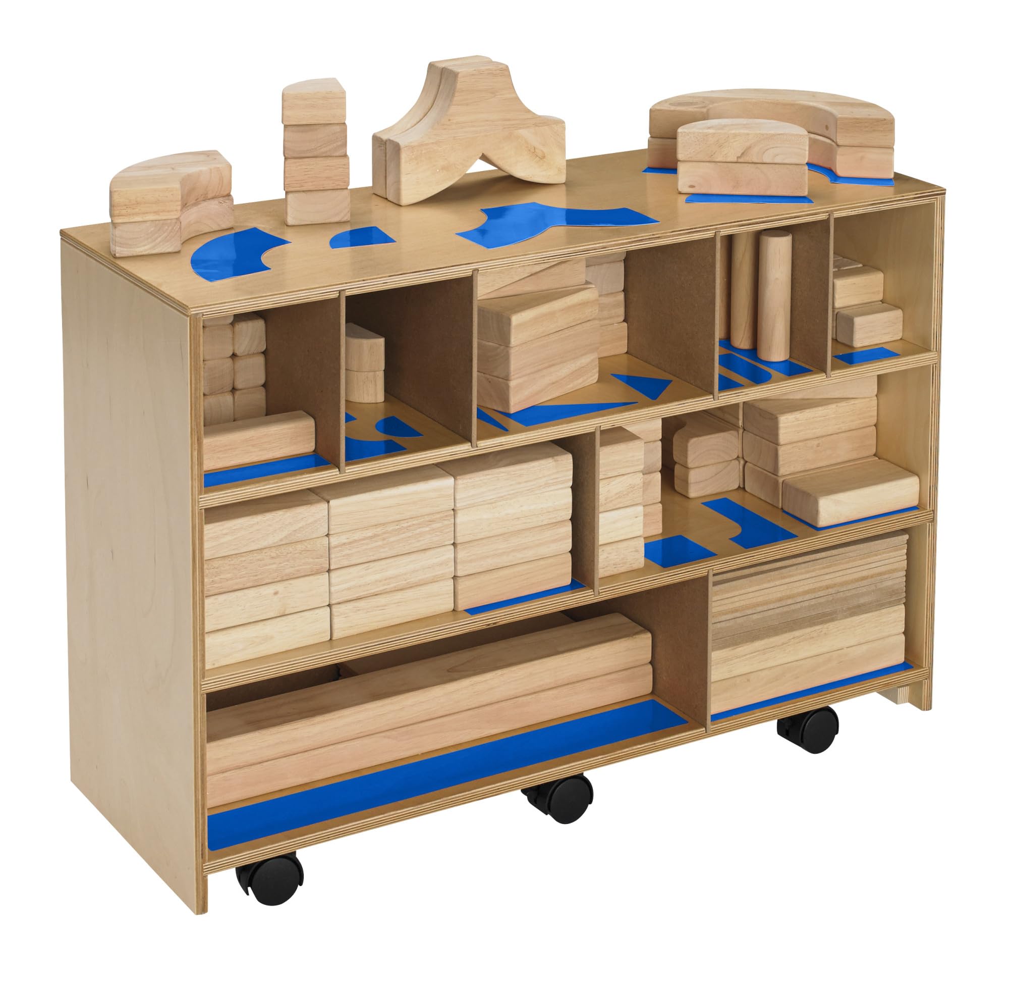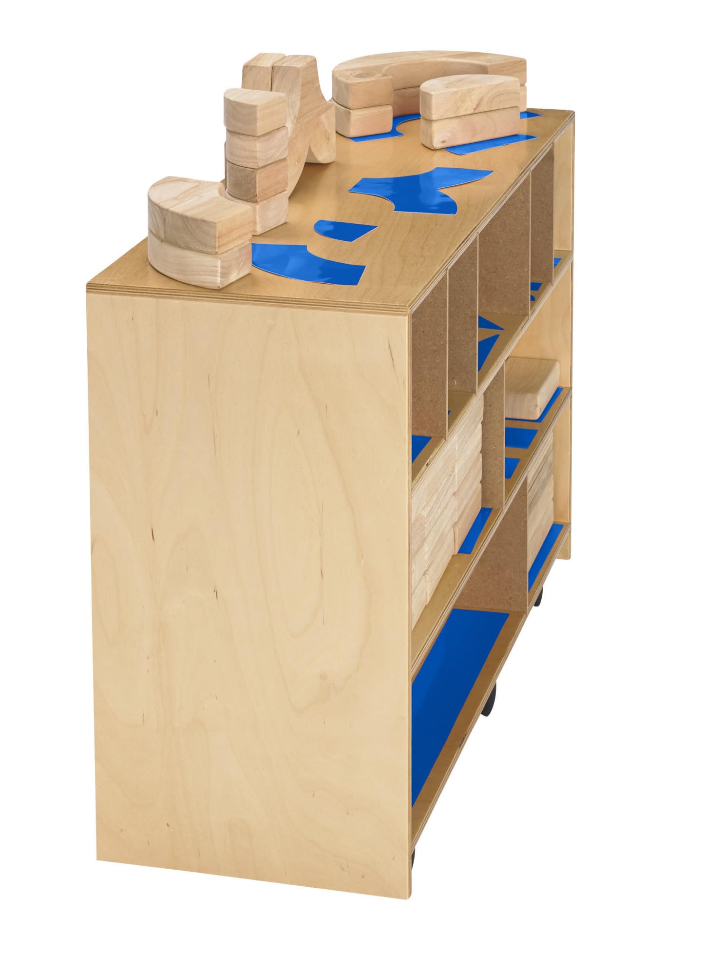 - Child-Safe*: Keep building blocks organized in classrooms with this mobile storage cabinet. The wooden cabinet features wheels, open shelves, and multiple compartments for easy toy organization.